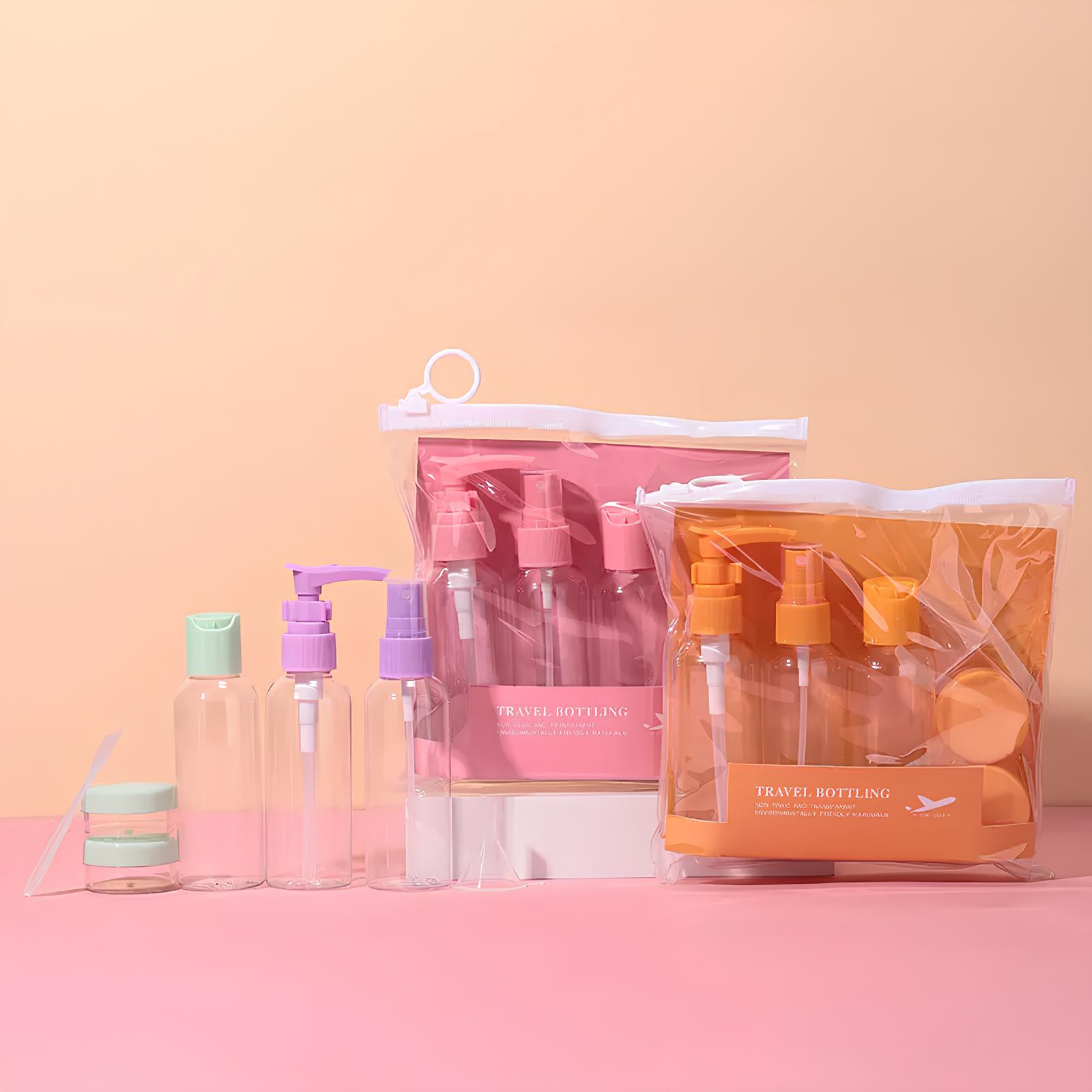 Versatile and Convenient: The set includes a dispenser bottle, spray bottle, squeeze bottle, and two round jars, available in purple, green, magenta, and yellow, offering flexible storage for various liquids and adding a pop of color to your travel essentials.