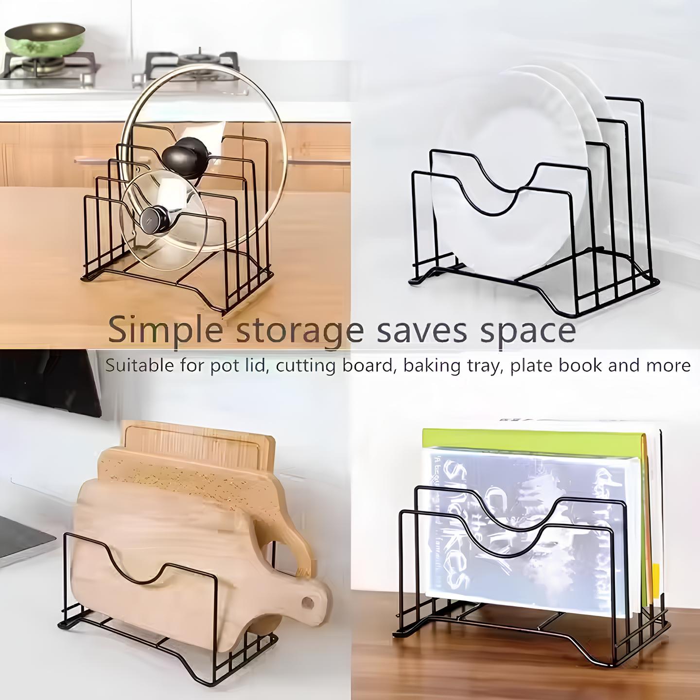 Multi-Functional & Stylish Design – Features a sleek black design with 4 slots, perfect for organizing pot lids, thin pans, cutting boards, bakeware, or even as a bookshelf for magazines and books.