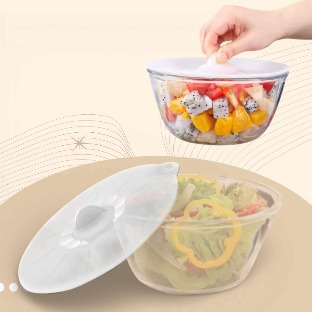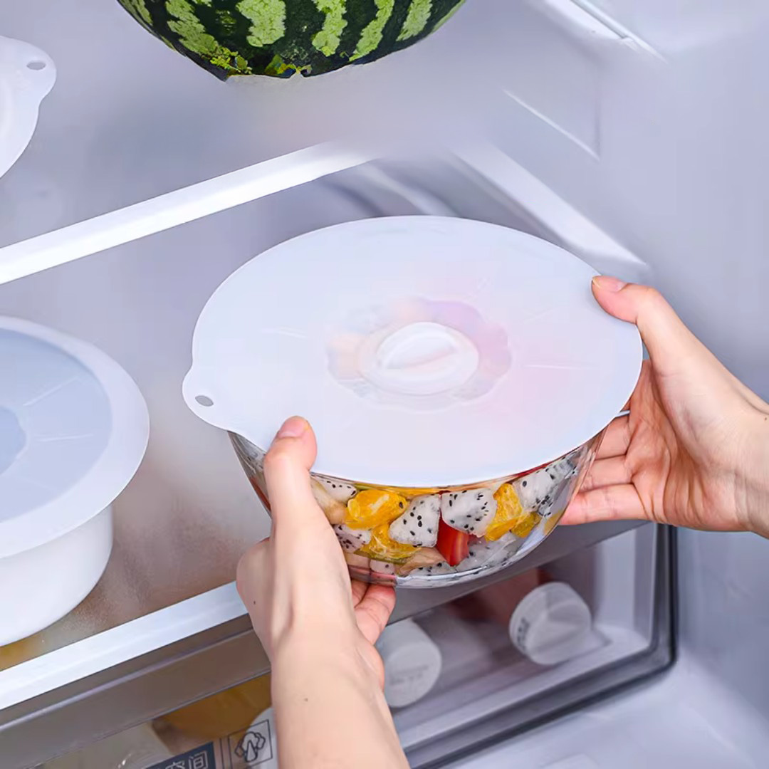 Reusable Silicone Stretch Lid: Flexible silicone cover stretches to fit various bowl sizes and shapes for secure food covering.