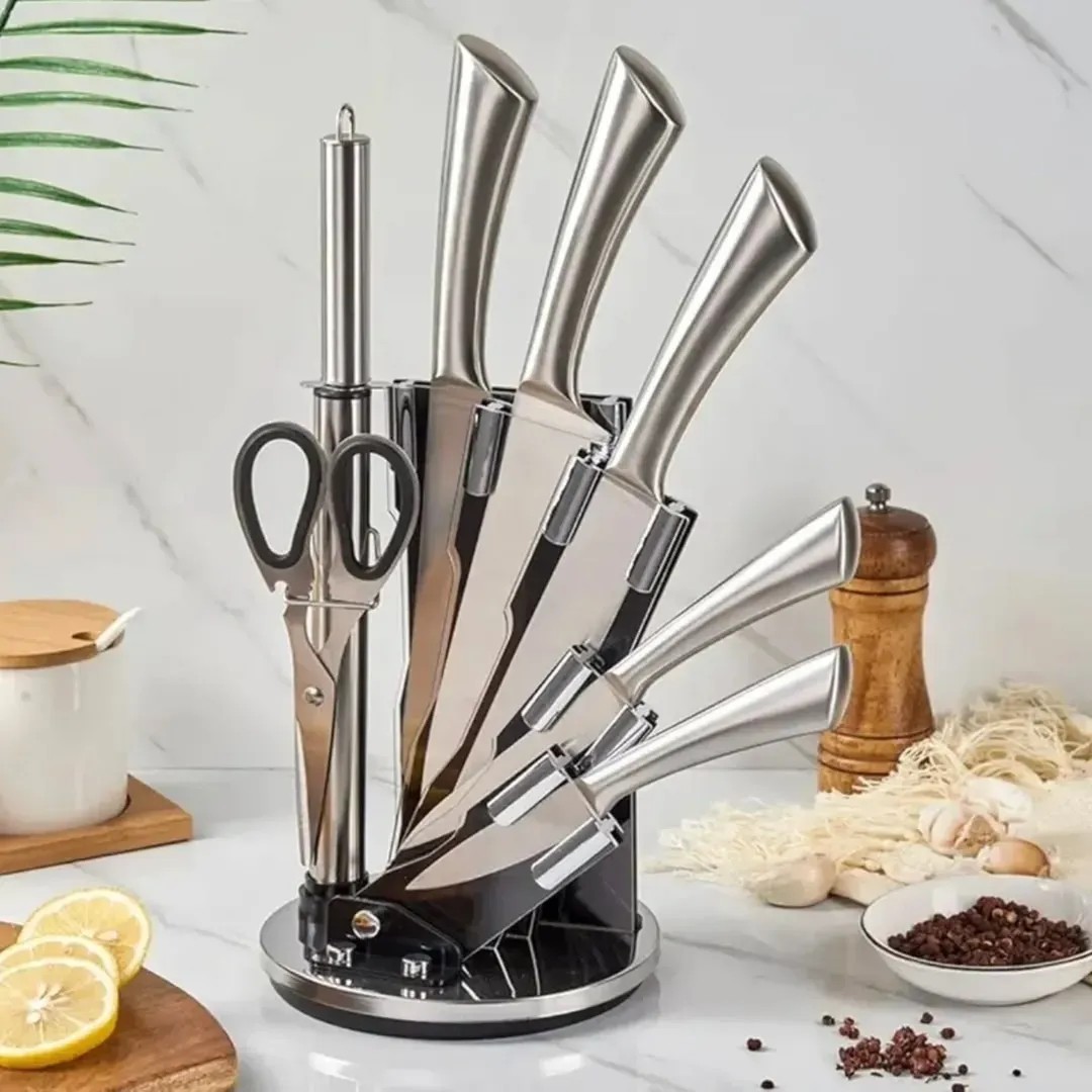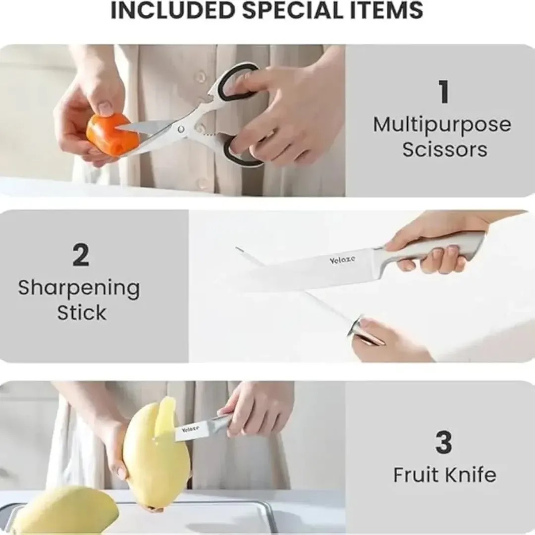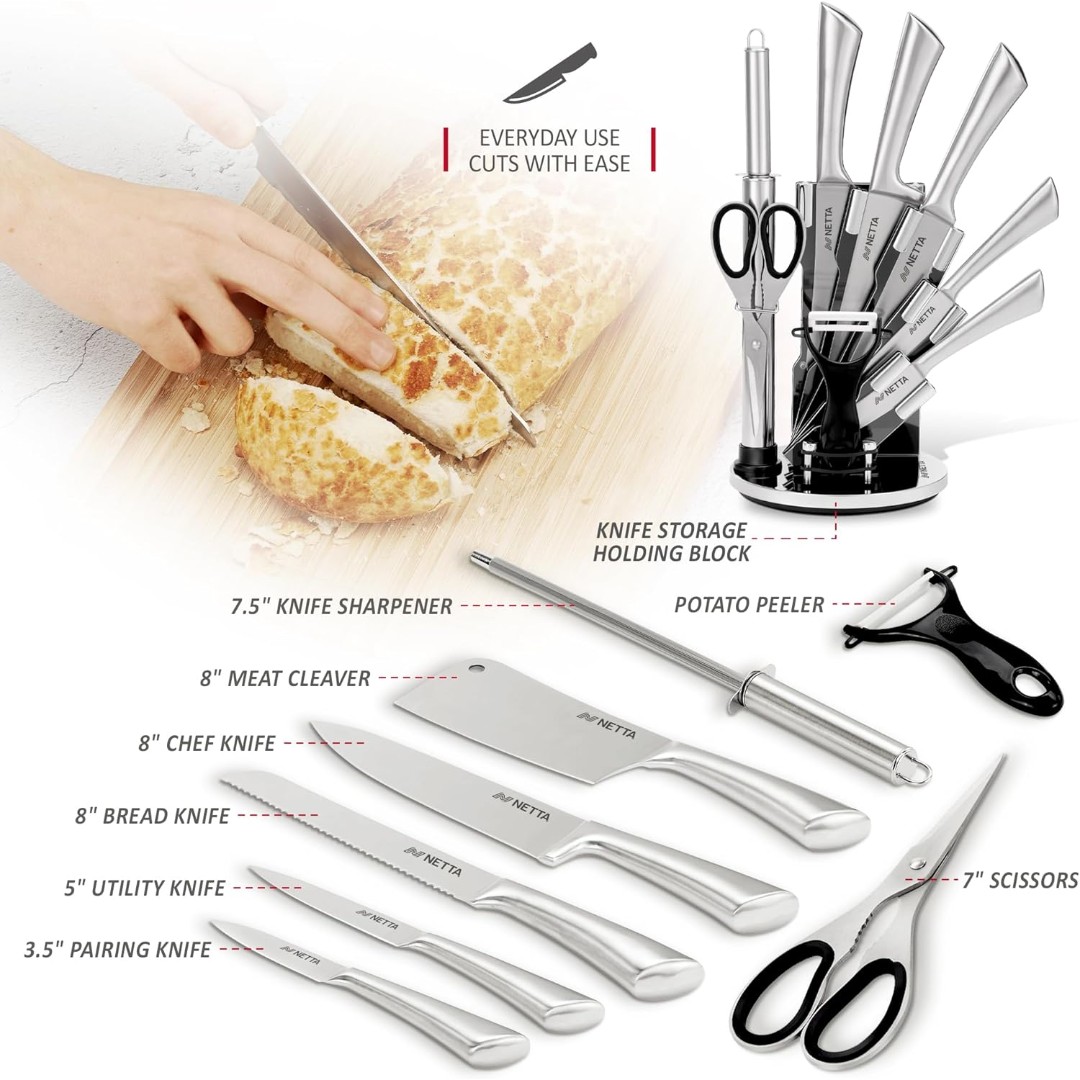 Complete 9-Piece Knife Set: Includes essential knives, kitchen scissors, potato peeler, built-in knife sharpener, and a modern storage block for full food preparation needs.