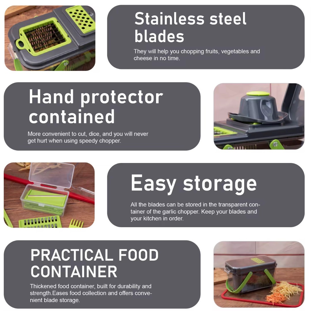Multi-Function Cutting System: Includes multiple interchangeable blades for slicing, dicing, grating, julienne, and chopping fruits, vegetables, and cheese with precision.