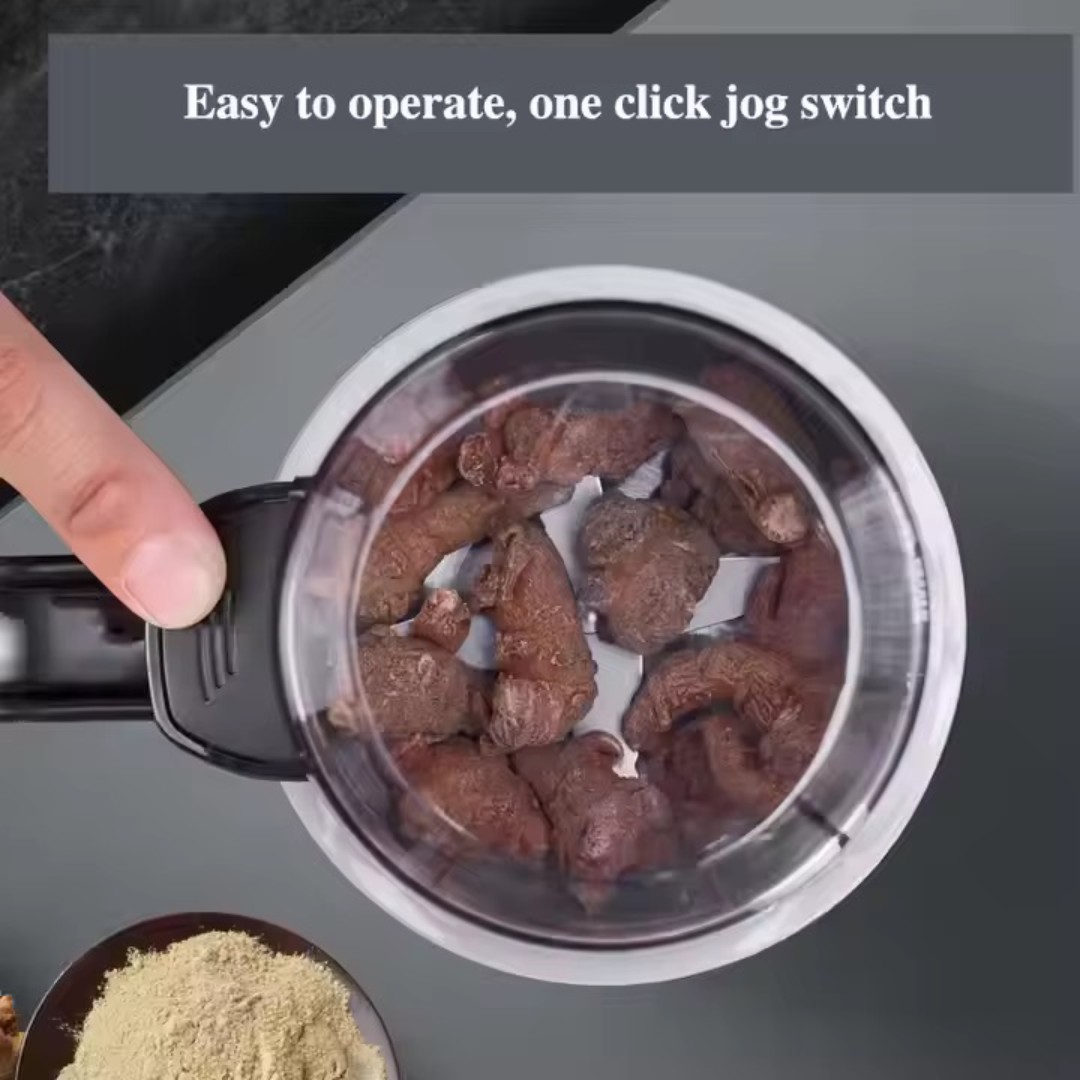محرك قوي عالي السرعة: مزودة بمحرك قوي تصل سرعته إلى 25,000 دورة في الدقيقة، مما يسمح بطحن التوابل والأعشاب وحبوب القهوة والحبوب والمكونات الجافة بسرعة وكفاءة.