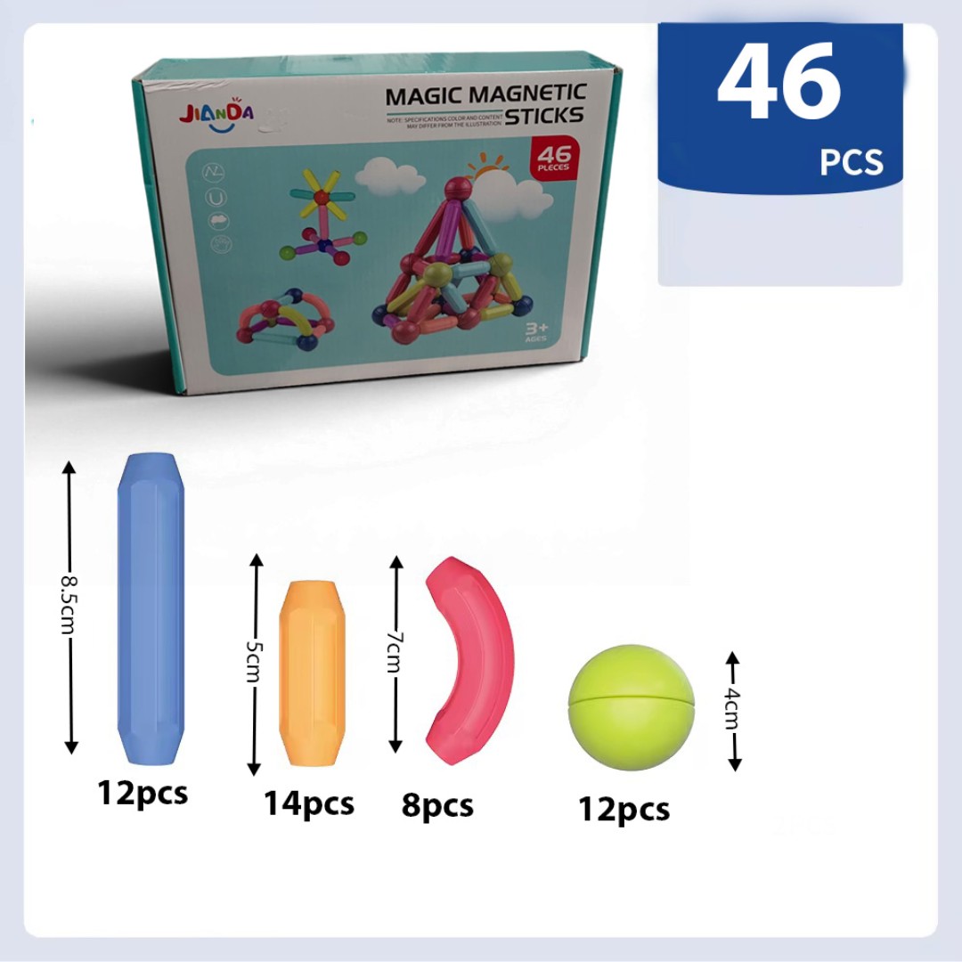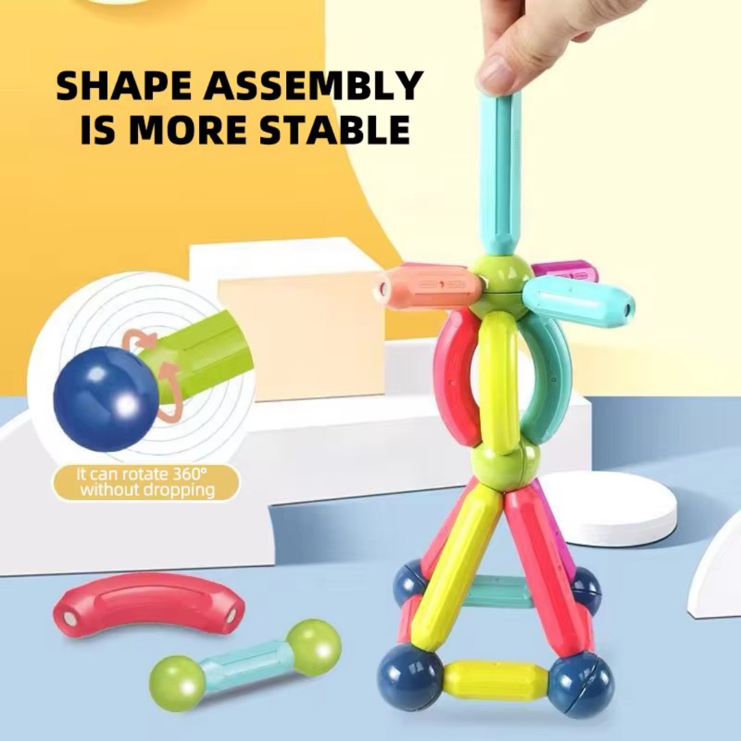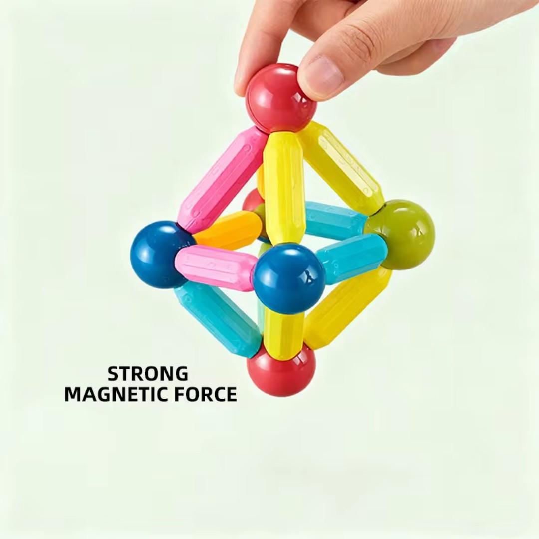 اتصال مغناطيسي قوي: تحتوي كل عصا وكرة على مغناطيس مدمج يتيح اتصالاً سهلاً وثابتاً، مما يسمح للأطفال ببناء أشكال ثنائية وثلاثية الأبعاد بسهولة.