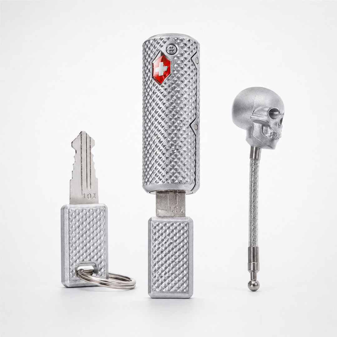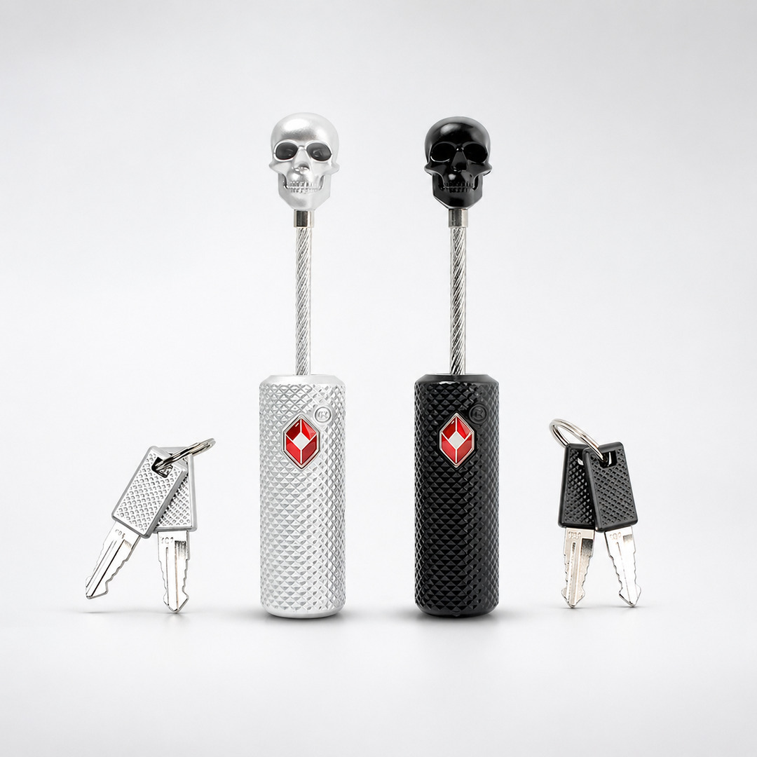 هيكل معدني بقبضة مانعة للانزلاق: مصنوع من معدن عالي الجودة بسطح محكم يمنع الانزلاق، مع تصميم رأس جمجمة أنيق يمنح شكلاً مميزاً وجريئاً.