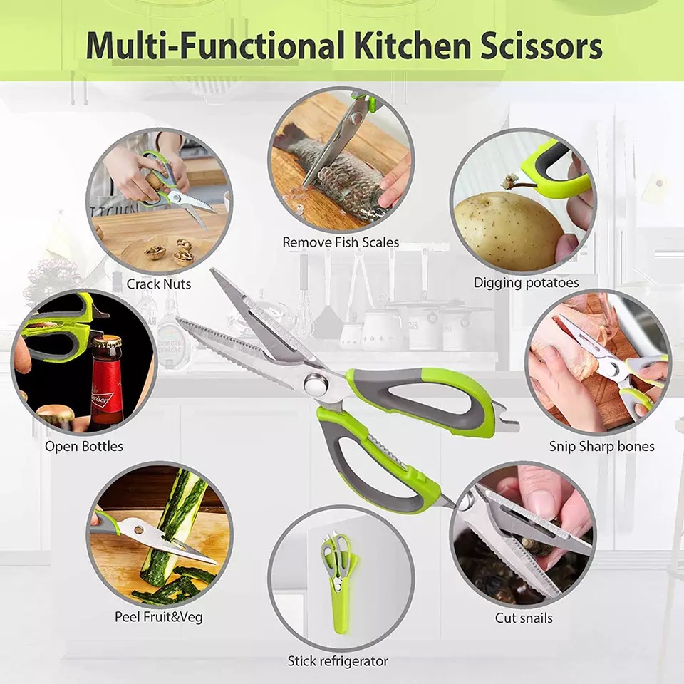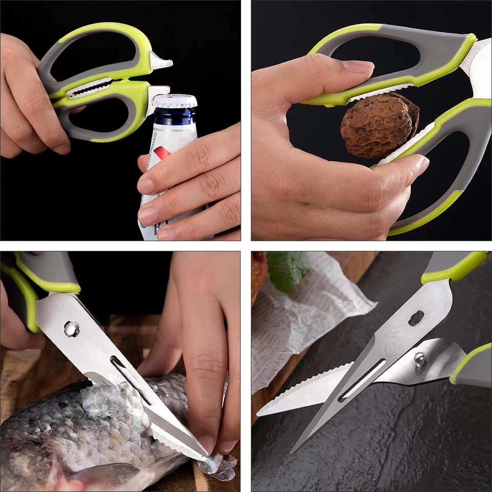 Multifunctional: cut meats, poultry, vegetables, herbs or food wraps with ease. It is also possible to open two types of bottles and even nut shells.