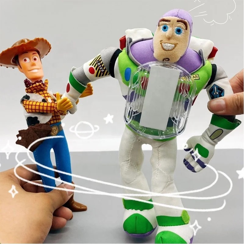 Woody is approximately 13.8 inches (35 cm), Buzz is approximately 11.8 inches (30 cm).