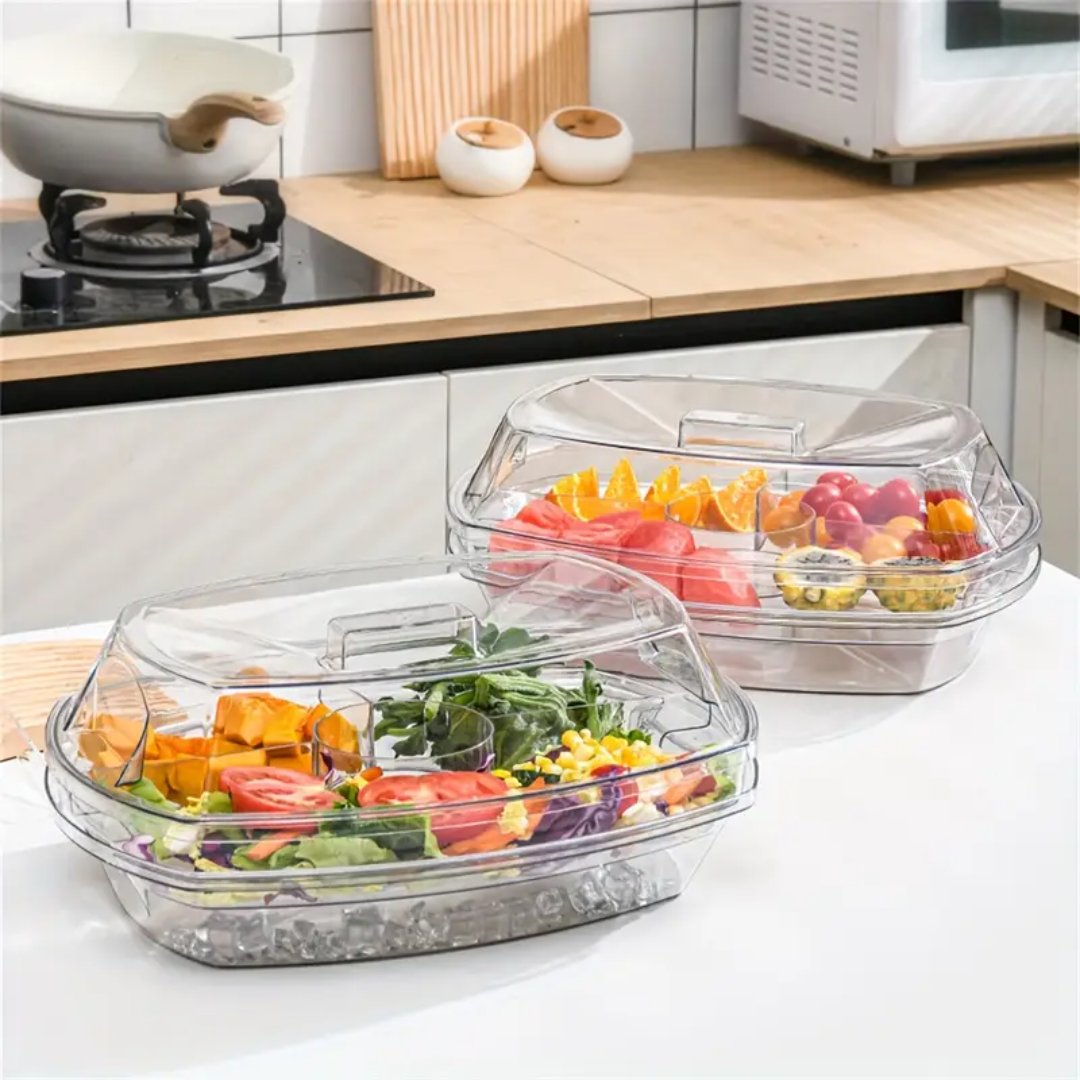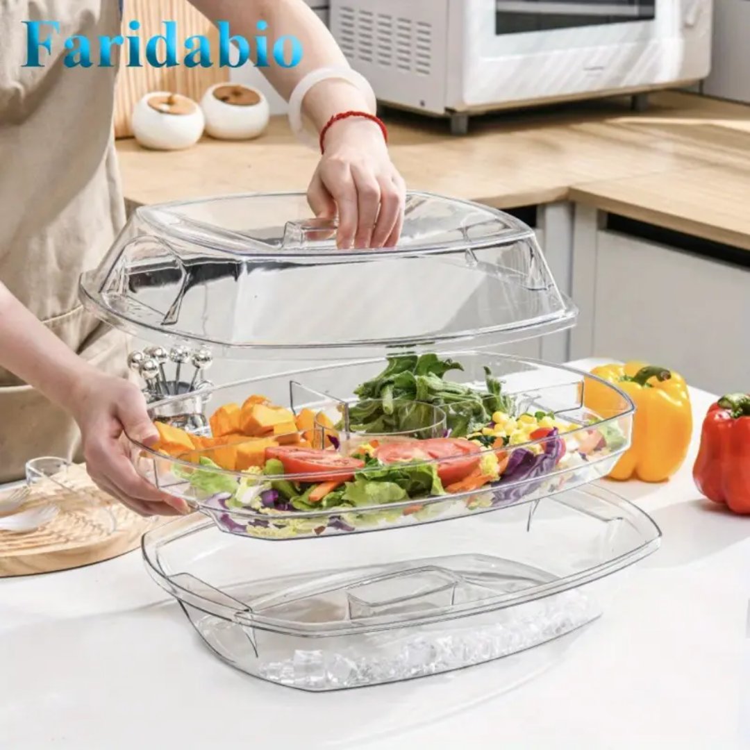Innovative 3-Tier Design – Features a transparent 3-tier structure with a lid to keep food fresh and bug-free. Includes a 4-compartment ice tray at the bottom to keep dishes chilled and perfectly displayed.