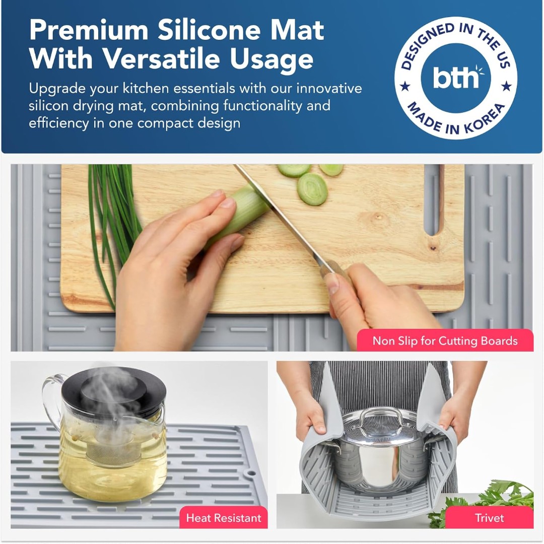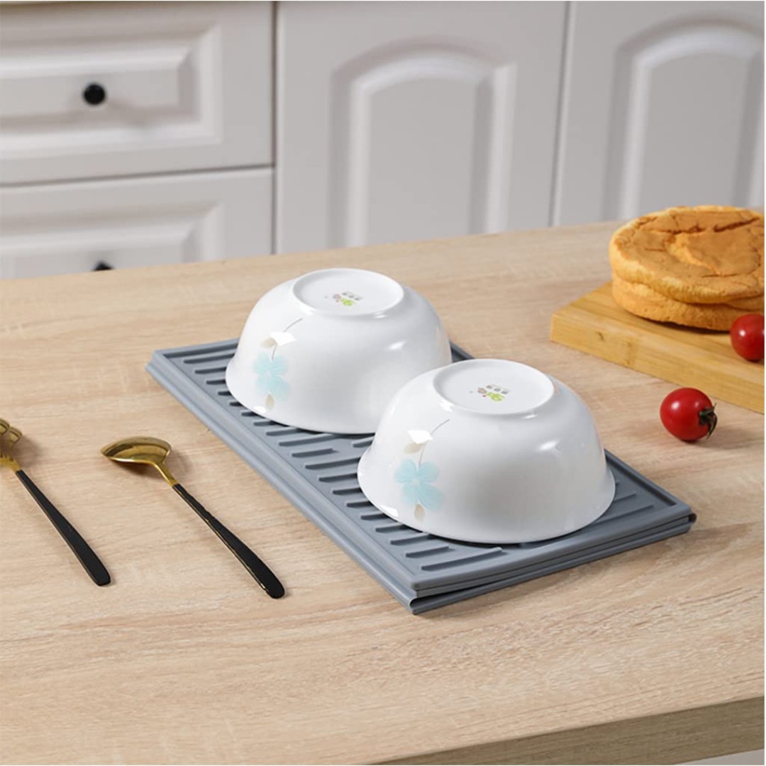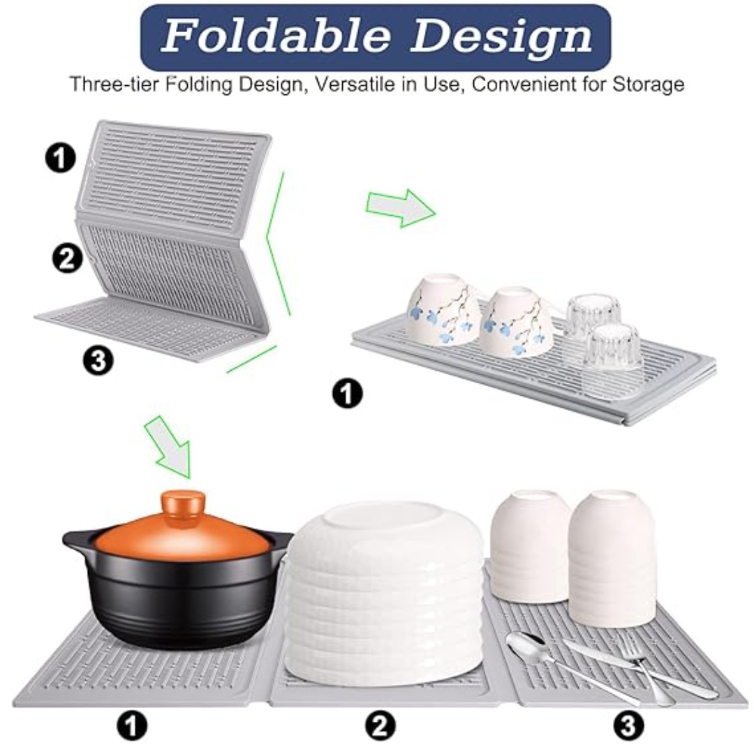 Foldable Silicone Drying Mat: Large 60.5×33cm tri-fold design expands wide for drying dishes, cups, and cookware.
