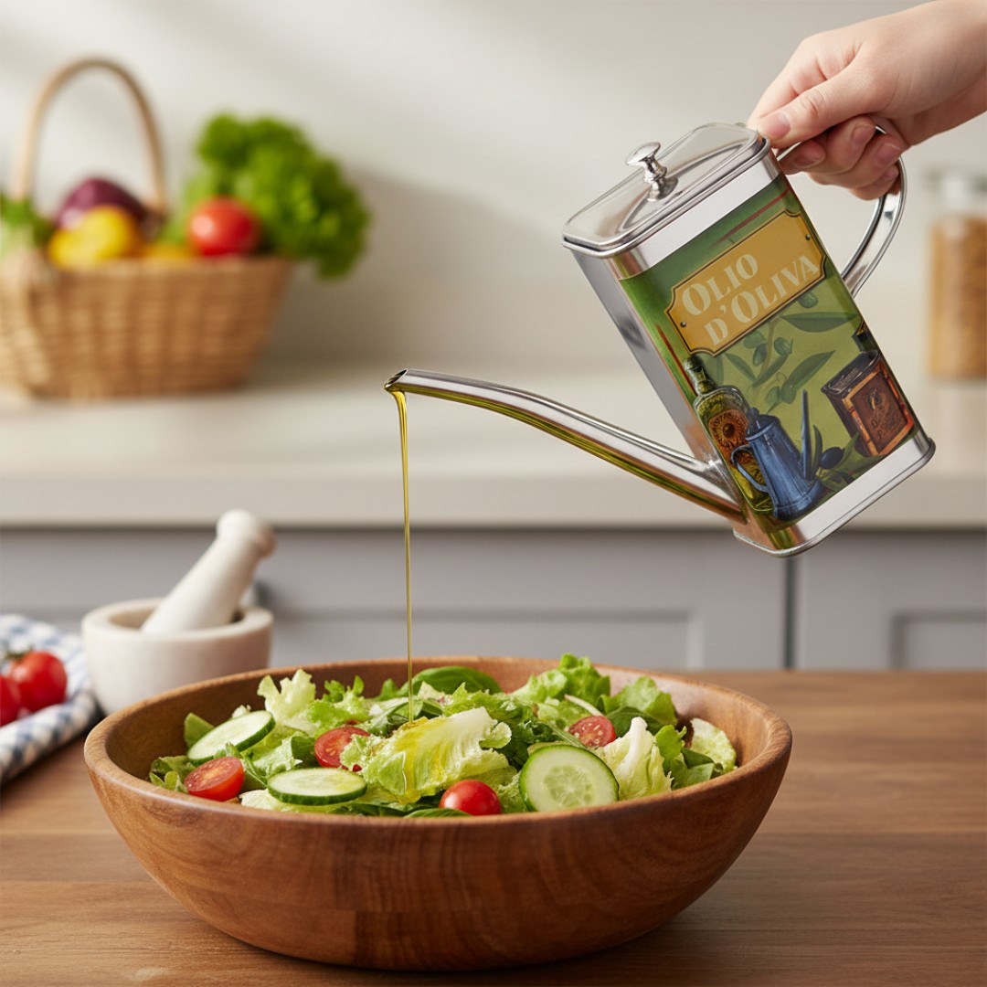 High-Precision Pouring Spout: Long, slim stainless steel spout ensures smooth, controlled pouring without dripping or spilling, ideal for salads and cooking.