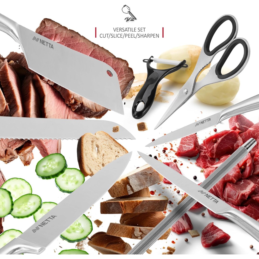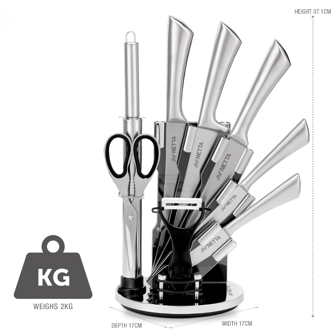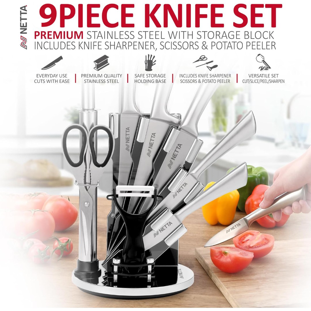 Complete 9-Piece Knife Set: Includes essential knives, kitchen scissors, potato peeler, built-in knife sharpener, and a modern storage block for full food preparation needs.
