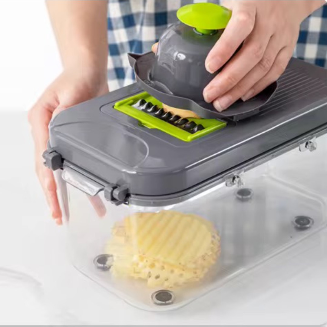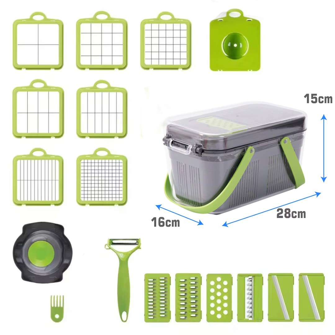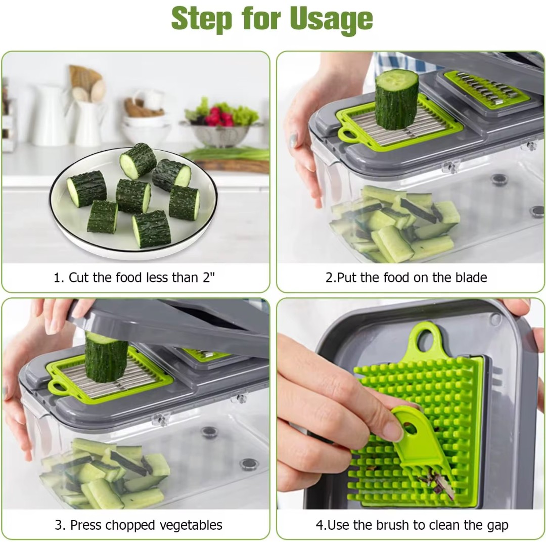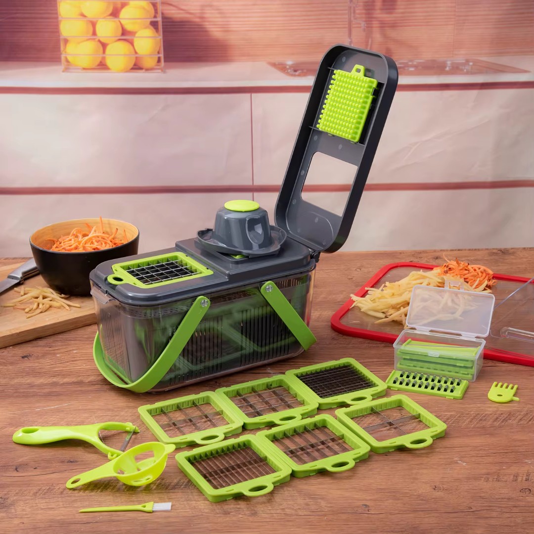 Multi-Function Cutting System: Includes multiple interchangeable blades for slicing, dicing, grating, julienne, and chopping fruits, vegetables, and cheese with precision.
