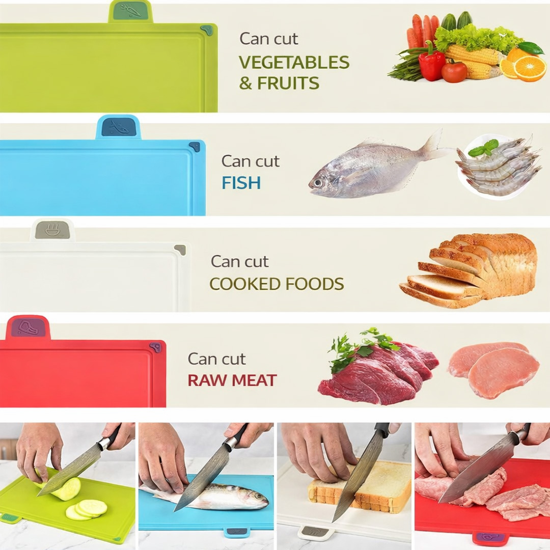 Color-Coded Boards: Multiple colored cutting boards help separate meat, fish, vegetables, fruits, and cooked foods to reduce cross-contamination.