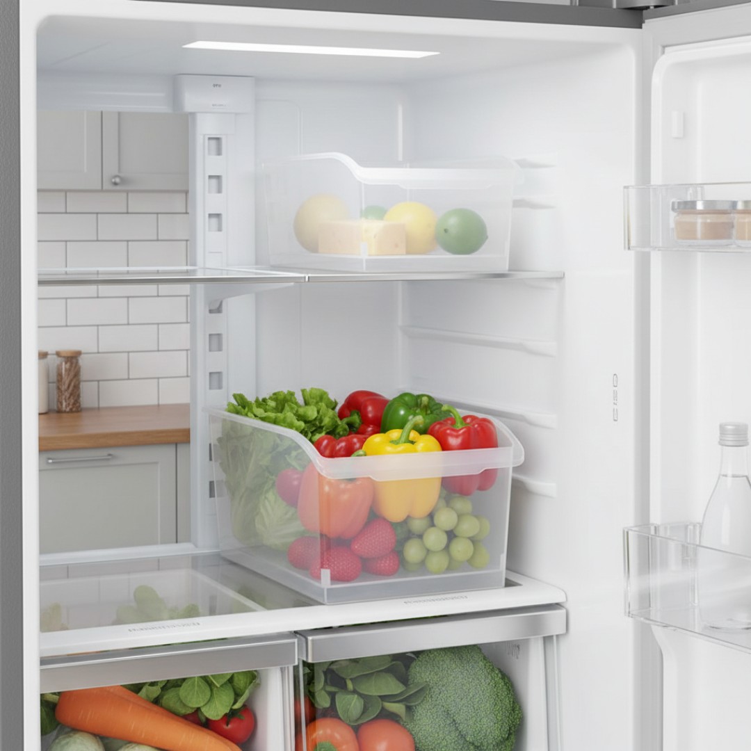 Large Space-Saving Capacity: Deep rectangular structure provides generous storage for produce, drinks, and groceries while keeping the fridge neatly organized.