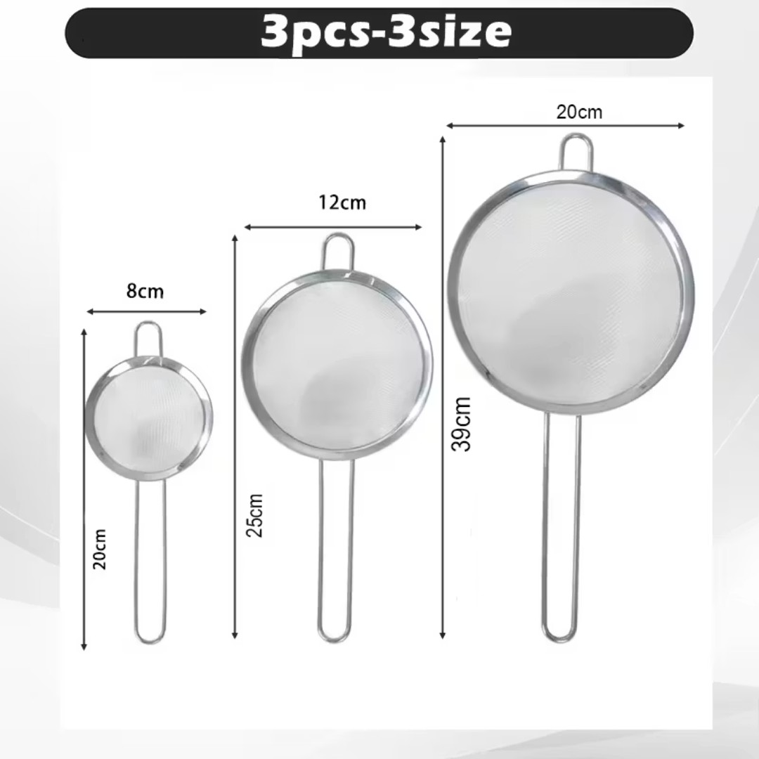 Three Convenient Sizes Set: Includes three practical sizes (8cm, 12cm, and 20cm) to handle different kitchen tasks such as rinsing fruits, draining pasta, sifting flour, or straining sauces.