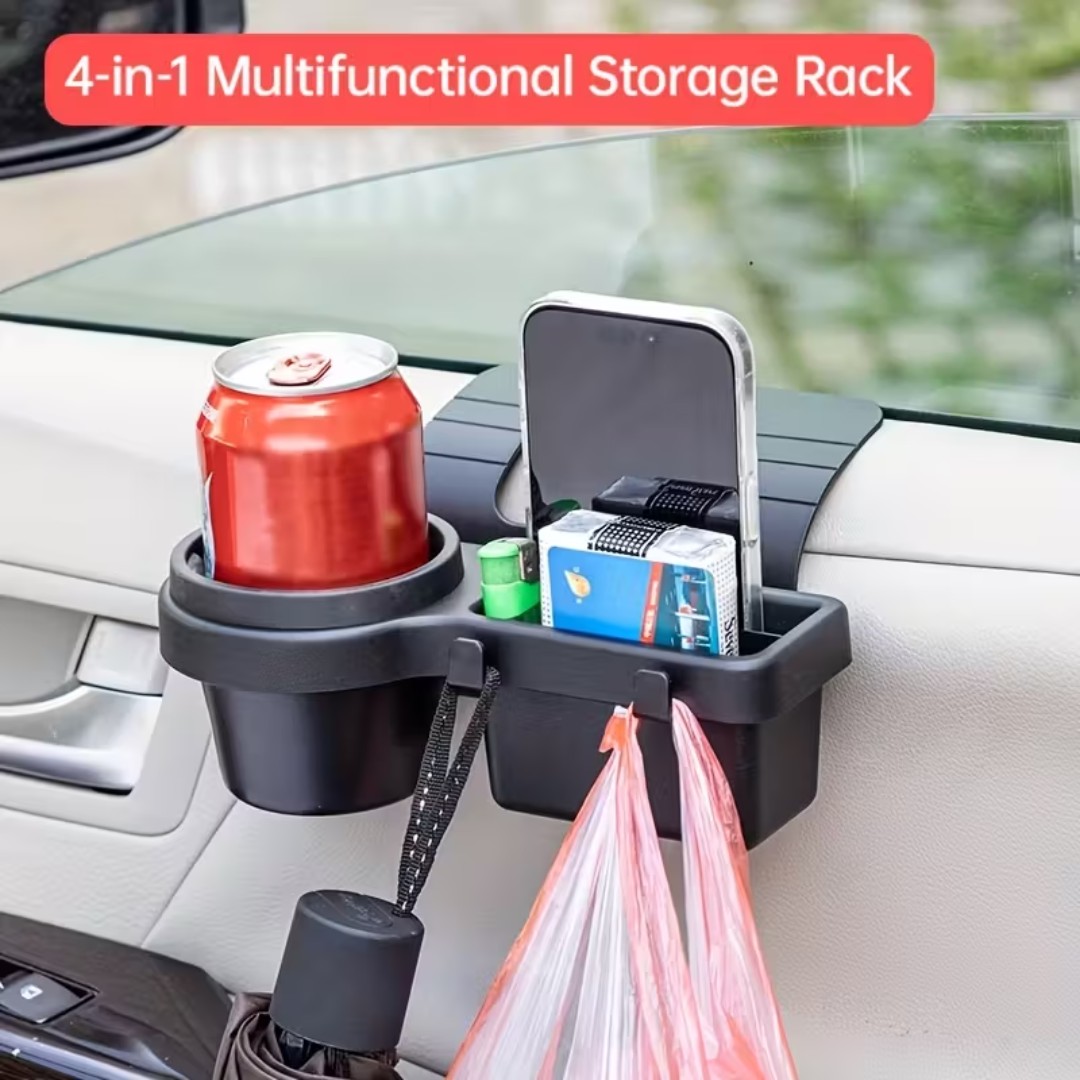 4-in-1 Multifunctional Car Organizer: Smart design combines a cup holder, phone holder, storage box, and hanging hooks, keeping your car essentials organized and within easy reach.