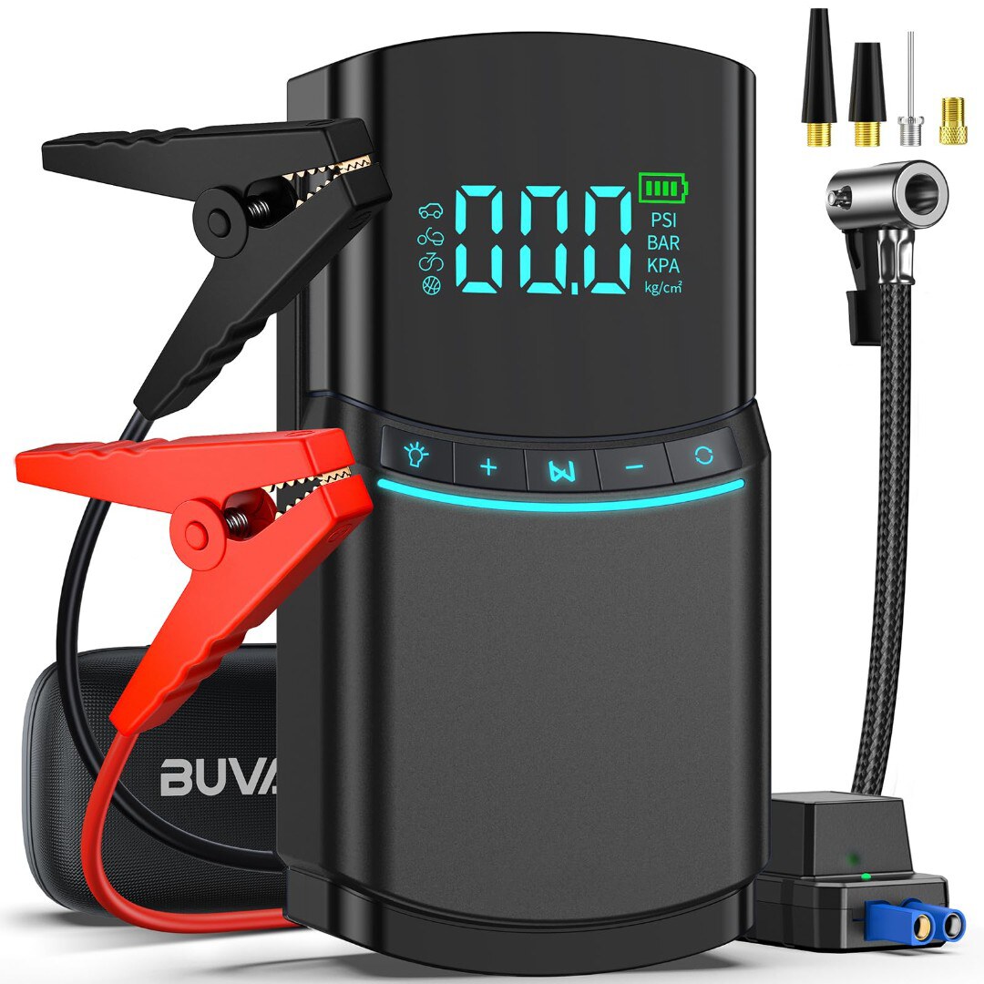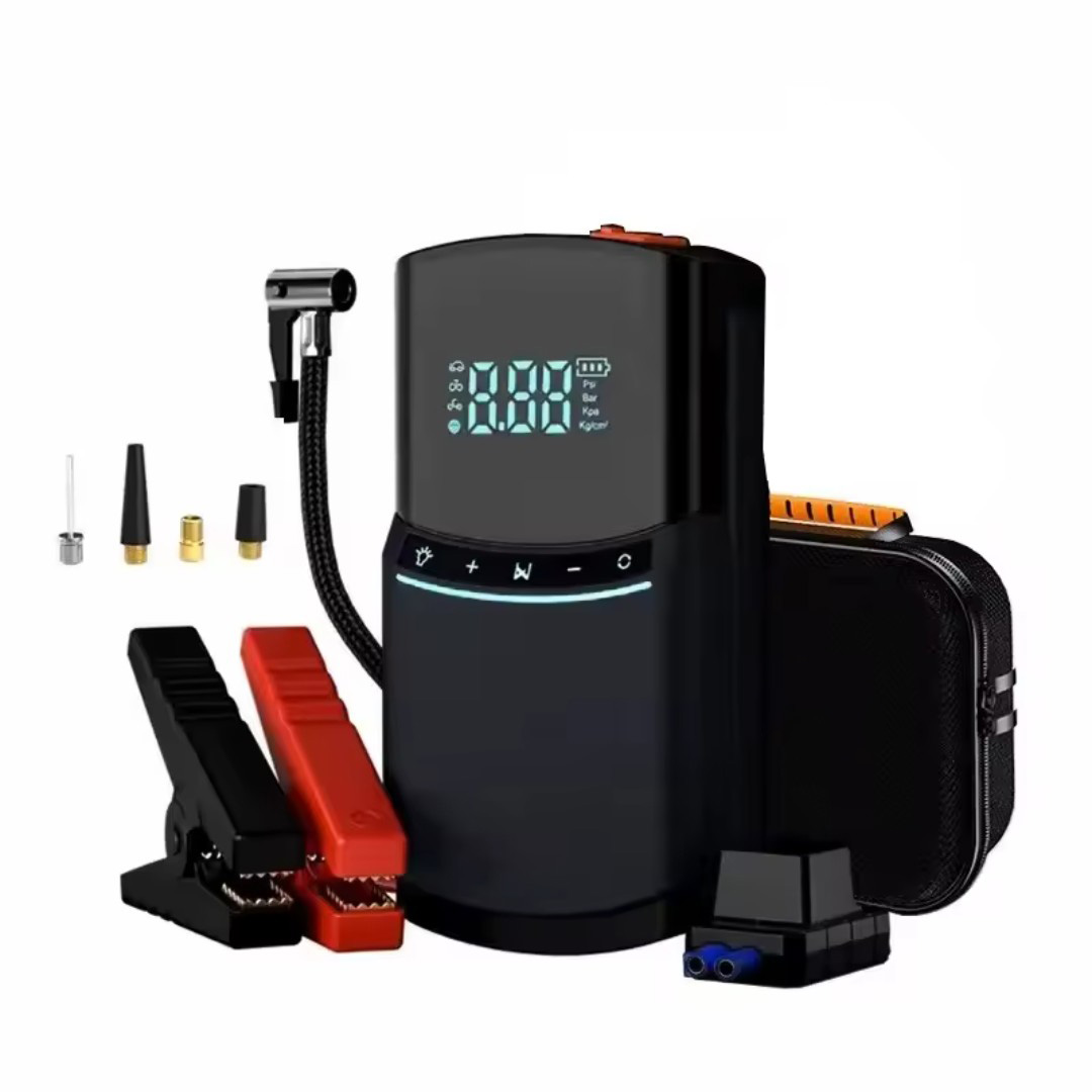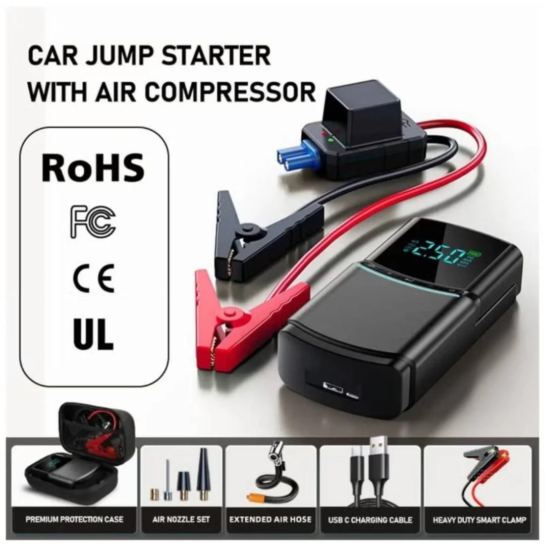 High-Power 4-in-1 Emergency Tool: Combines car jump starter, air compressor, power bank, and LED flashlight in one compact device, making it essential for every driver.