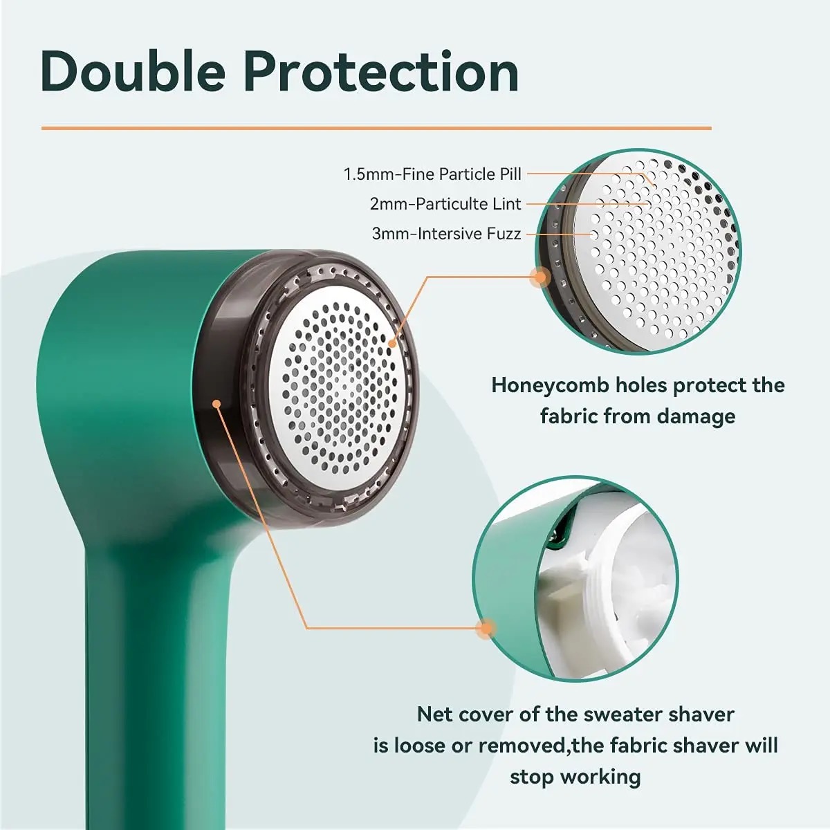 【حماية مزدوجة】 يمكن للشبكة الإلكترونية المطورة على شكل قرص العسل أن تحمي القماش من التلف. شبكة السكاكين من الفولاذ المقاوم للصدأ، ذات قوس بسيط، تناسب الملابس بسلاسة، وتقطع وتضغط دون تشوه، وتحافظ على سلامة رأس السكين، ولا تلحق الضرر بالملابس. إذا كان الغطاء الشبكي لماكينة إزالة الوبر مفككًا أو تمت إزالته، فستتوقف ماكينة الحلاقة عن العمل على الفور لتجنب الخطر أو تلف القماش.