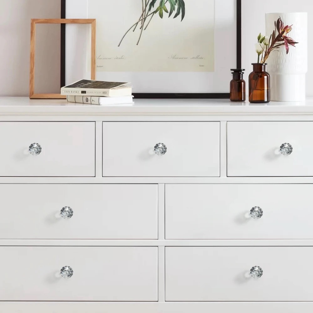 المواد: مقابض خزانة الماس مصنوعة من الزجاج الكريستالي + سبائك الألومنيوم، مصقولة بدرجة عالية، لذلك فهي متينة للغاية ويمكن أن تدوم لسنوات، لذلك لا تضطر إلى إنفاق الكثير على مقابض الأدراج الزجاجية.