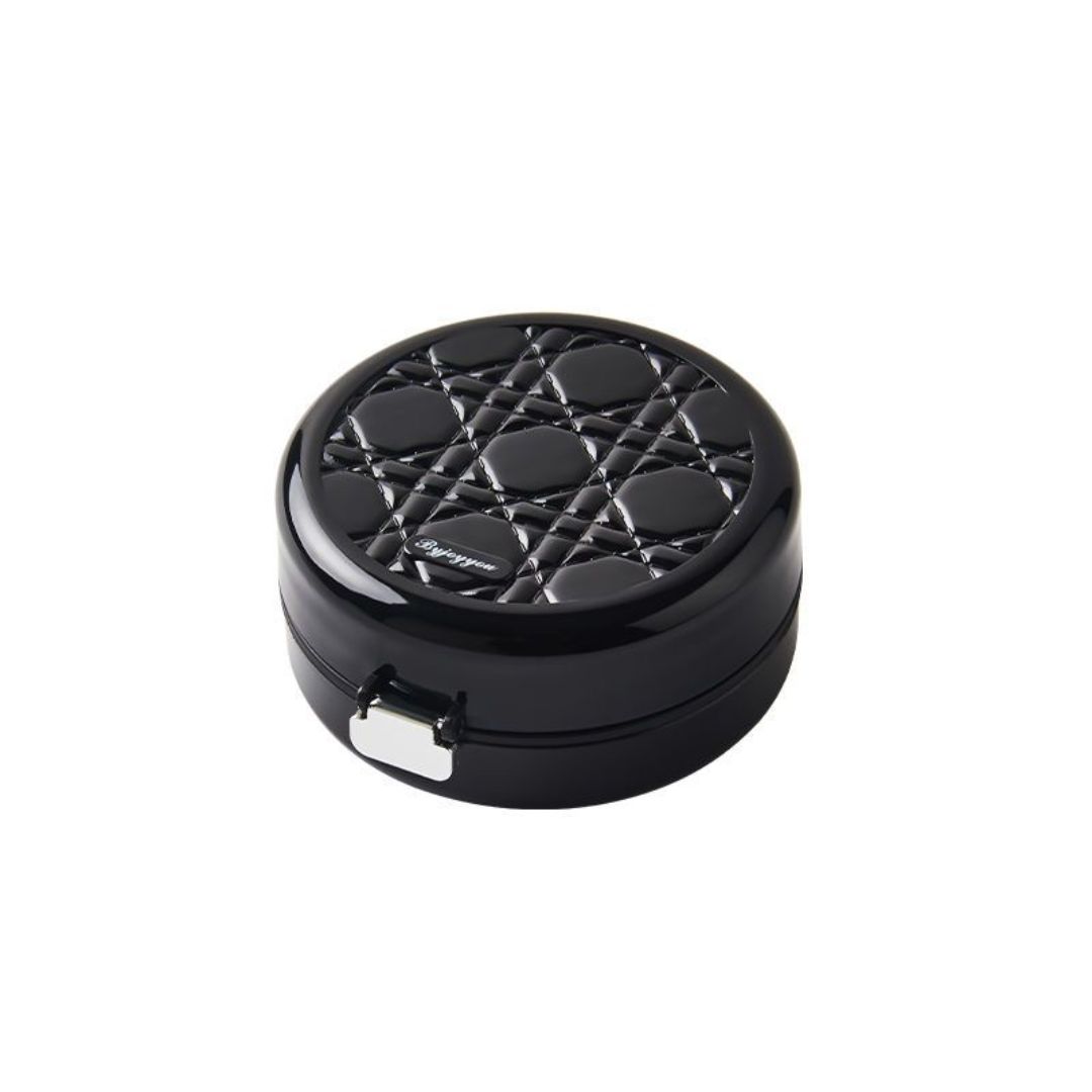 تصميم كلاسيكي: علبة مستديرة بسيطة باللون الأبيض أو الأسود، بتصميم أنيق ونظيف.
