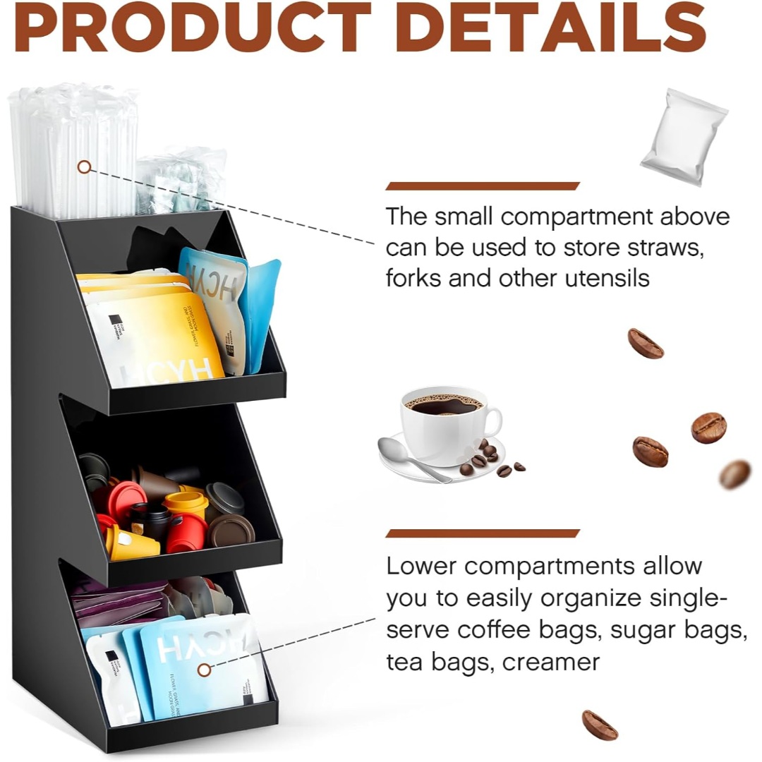 تصميم عمودي موفر للمساحة: يتميز هذا المنظم ذو الثلاث طبقات بخمسة أقسام مائلة لتخزين القش، السكر، أكياس الشاي، الكريمات، والمزيد بشكل مرتب مع الاستفادة القصوى من المساحة العمودية.