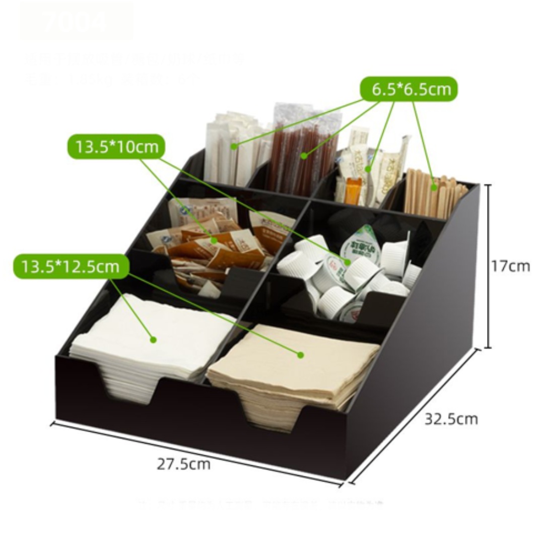 • أقسام تخزين مقسمة: يتضمن فتحات علوية (6.5×6.5 سم و13.5×10 سم) للأكواب والقش، ووعاء سفلي (13.5×12.5 سم) للمناديل أو كبسولات القهوة—مما يحافظ على العناصر مفصولة وسهلة الوصول.
