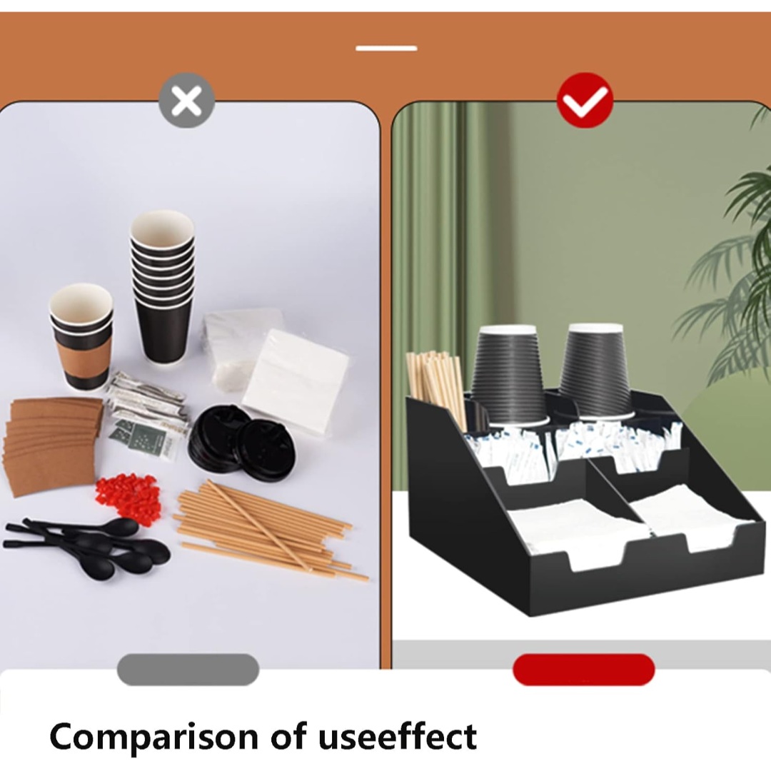 • منظم الطاولة موفر للمساحة: تصميم مدمج ذو طبقتين مع 6 أقسام، مثالي لتخزين أكواب القهوة، الأغطية، المحركين، المناديل، والتوابل في إعداد منظم واحد.