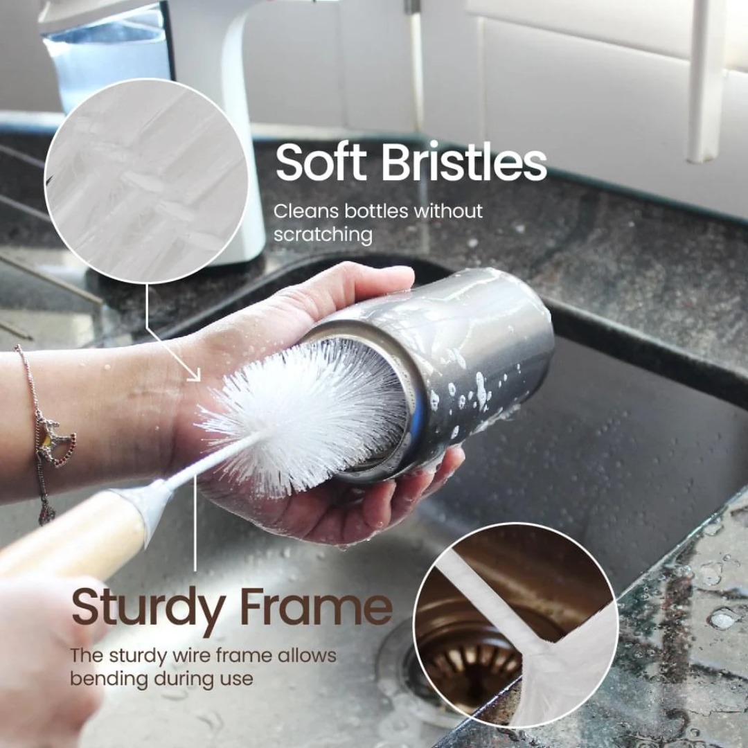 شعيرات طويلة ومرنة – بفضل طول الشعيرات (16 بوصة / حوالي 37 سم) وتصميمها المرن، تتيح تنظيفًا عميقًا داخل الزجاجات والحاويات التي يصعب الوصول إليها بالفرش التقليدية.