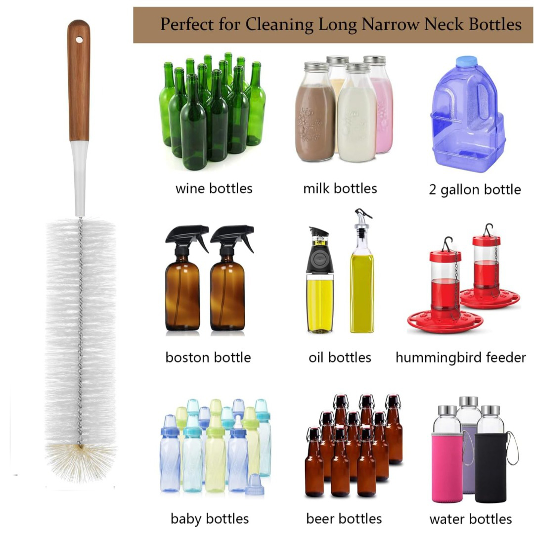 أداة تنظيف متعددة الاستخدامات – مثالية لتنظيف مختلف أنواع الزجاجات مثل زجاجات النبيذ، الحليب، المياه، البخاخات وحتى مغذيات الطيور. تصل بسهولة إلى الأعناق الضيقة والأماكن الصعبة التنظيف.