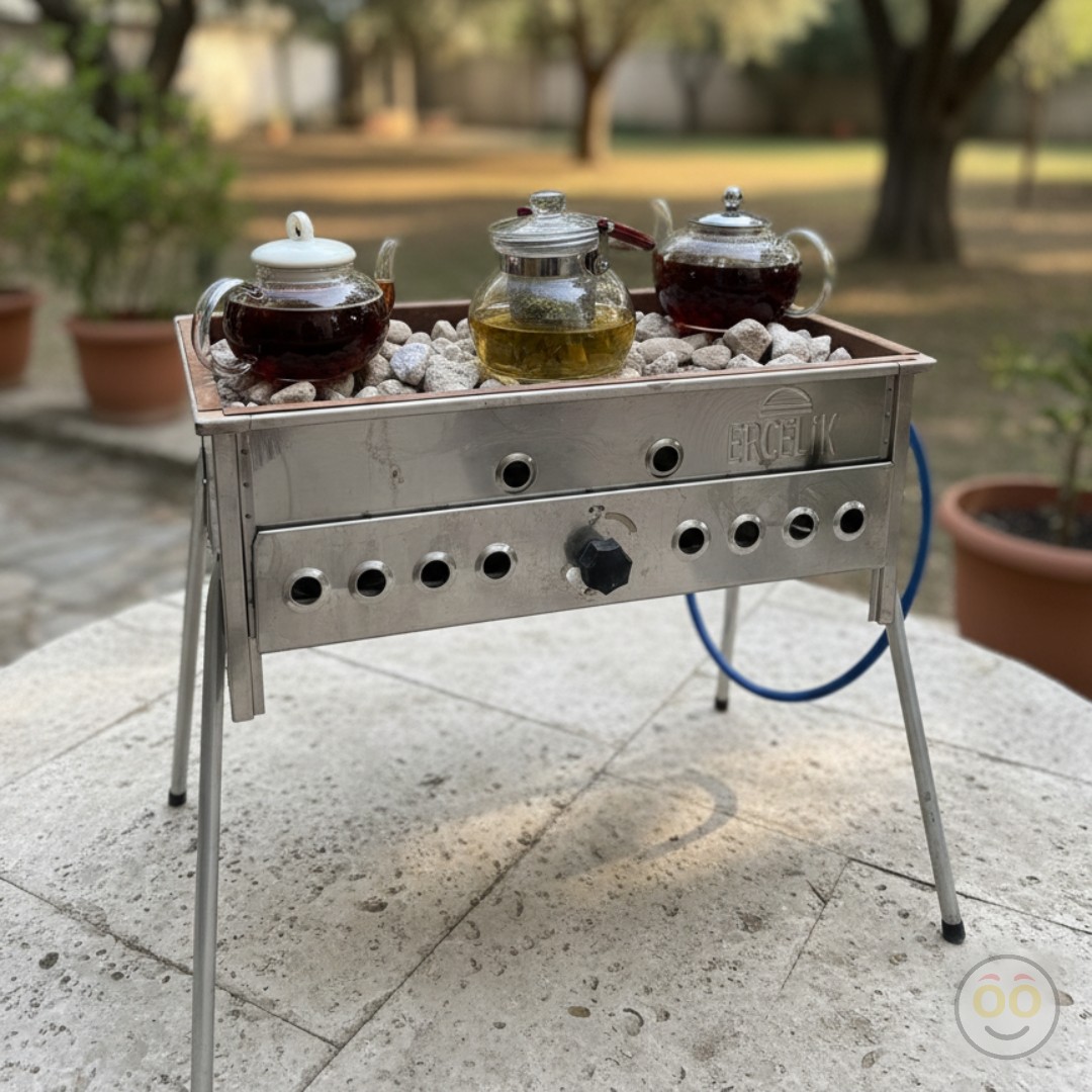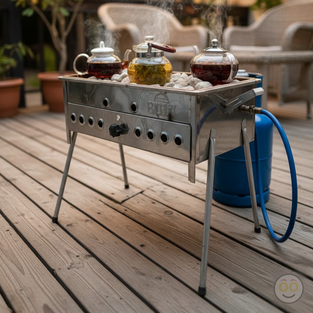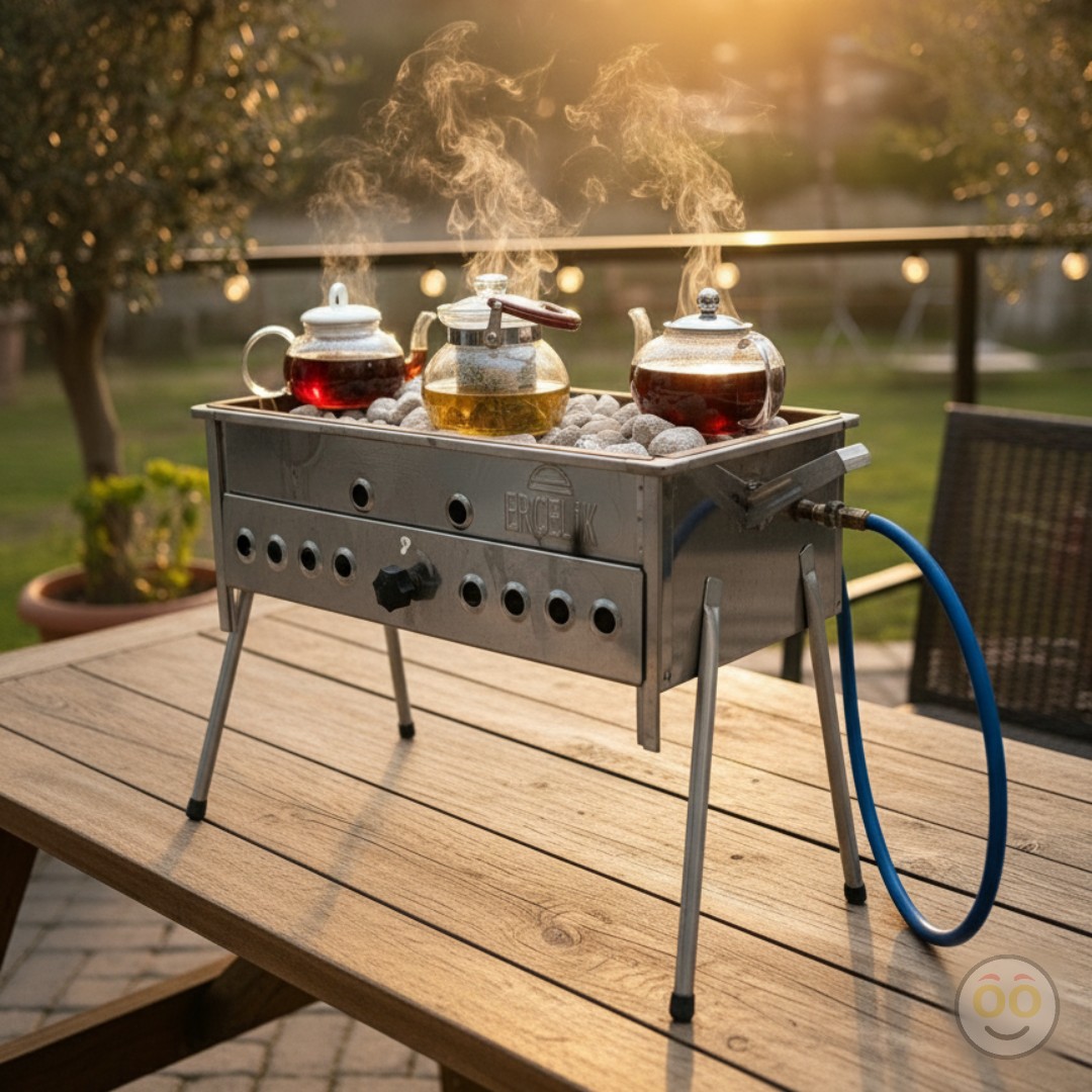 تصميم تركي تقليدي: سخان شاي خارجي مصنوع بأسلوب تركي كلاسيكي لتسخين عدة أباريق شاي في الوقت نفسه.