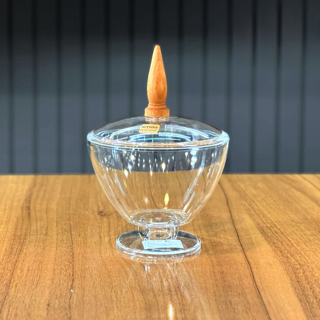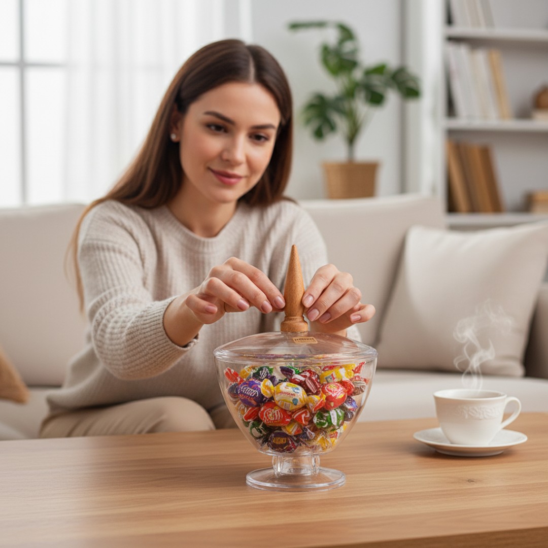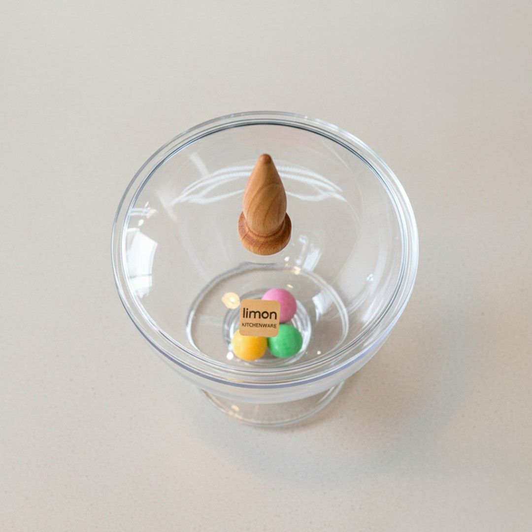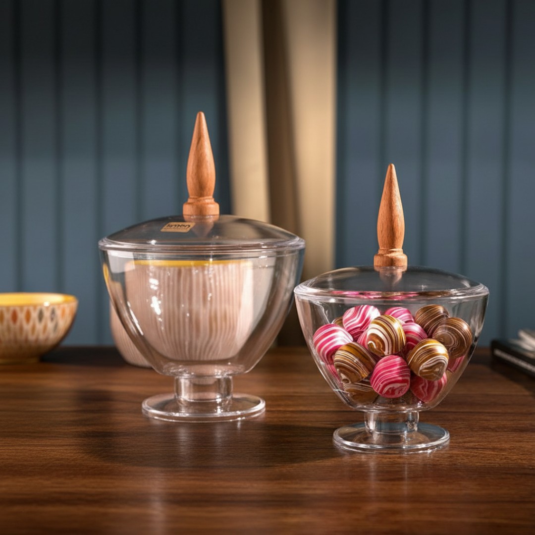 تصميم طبيعي أنيق: يتميز ببرطمان أكريليك كلاسيكي مع غطاء بمقبض خشبي يمنح مظهراً دافئاً وأنيقاً.