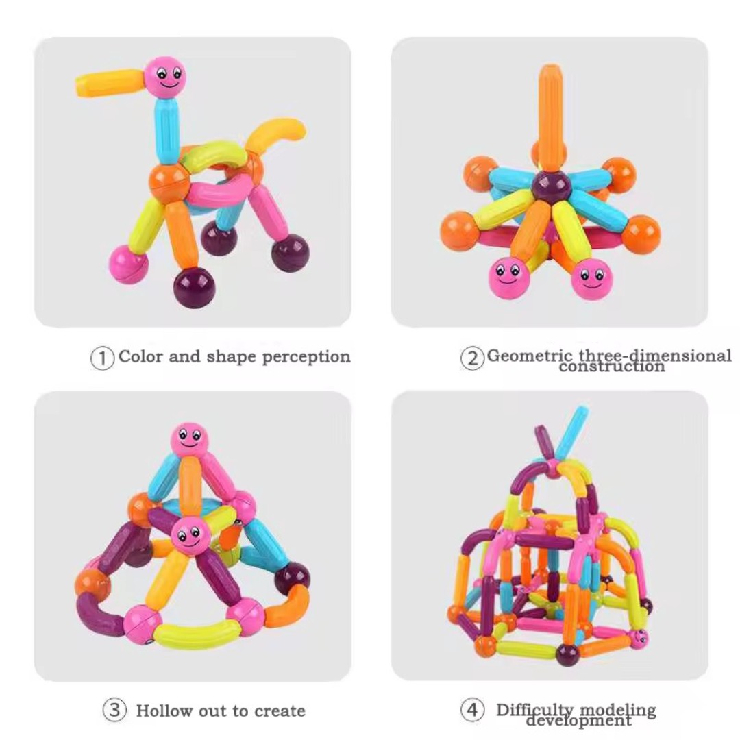اتصال مغناطيسي قوي: تحتوي كل عصا وكرة على مغناطيس مدمج يتيح اتصالاً سهلاً وثابتاً، مما يسمح للأطفال ببناء أشكال ثنائية وثلاثية الأبعاد بسهولة.