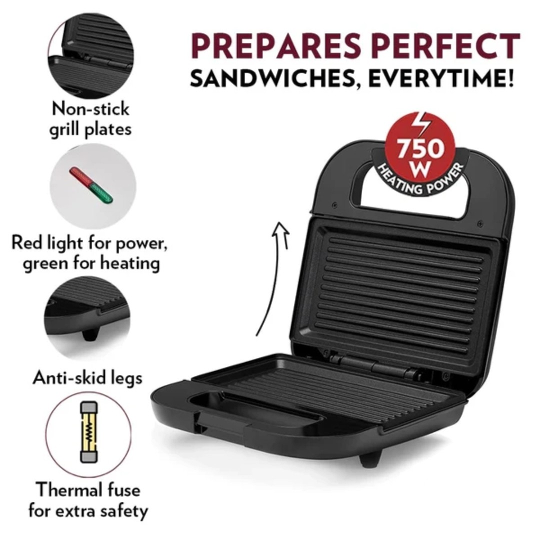 تسخين قوي بقدرة 850 واط: مزودة بنظام تسخين قوي يضمن تحميصاً وشواءً سريعاً ومتساوياً للحصول على ساندويتشات مثالية في كل مرة.