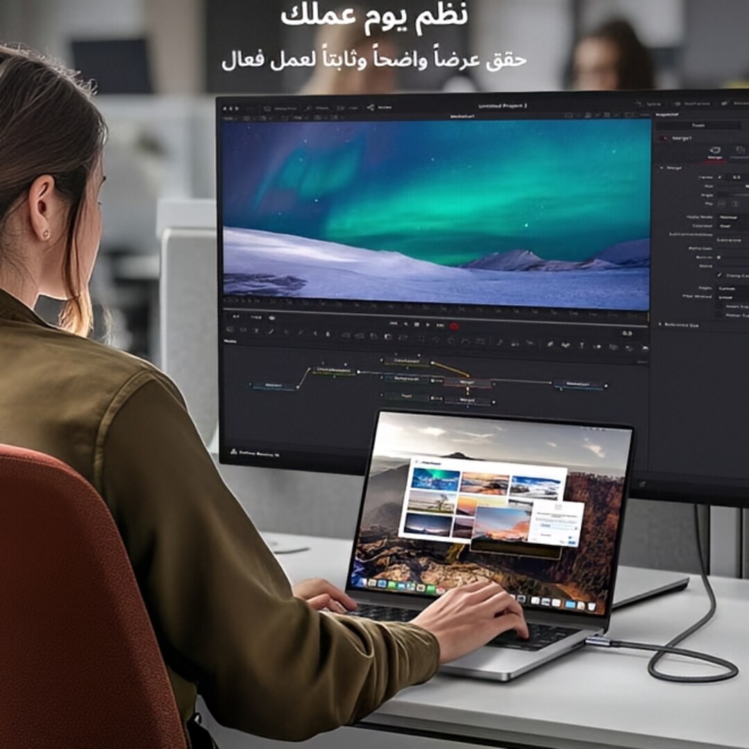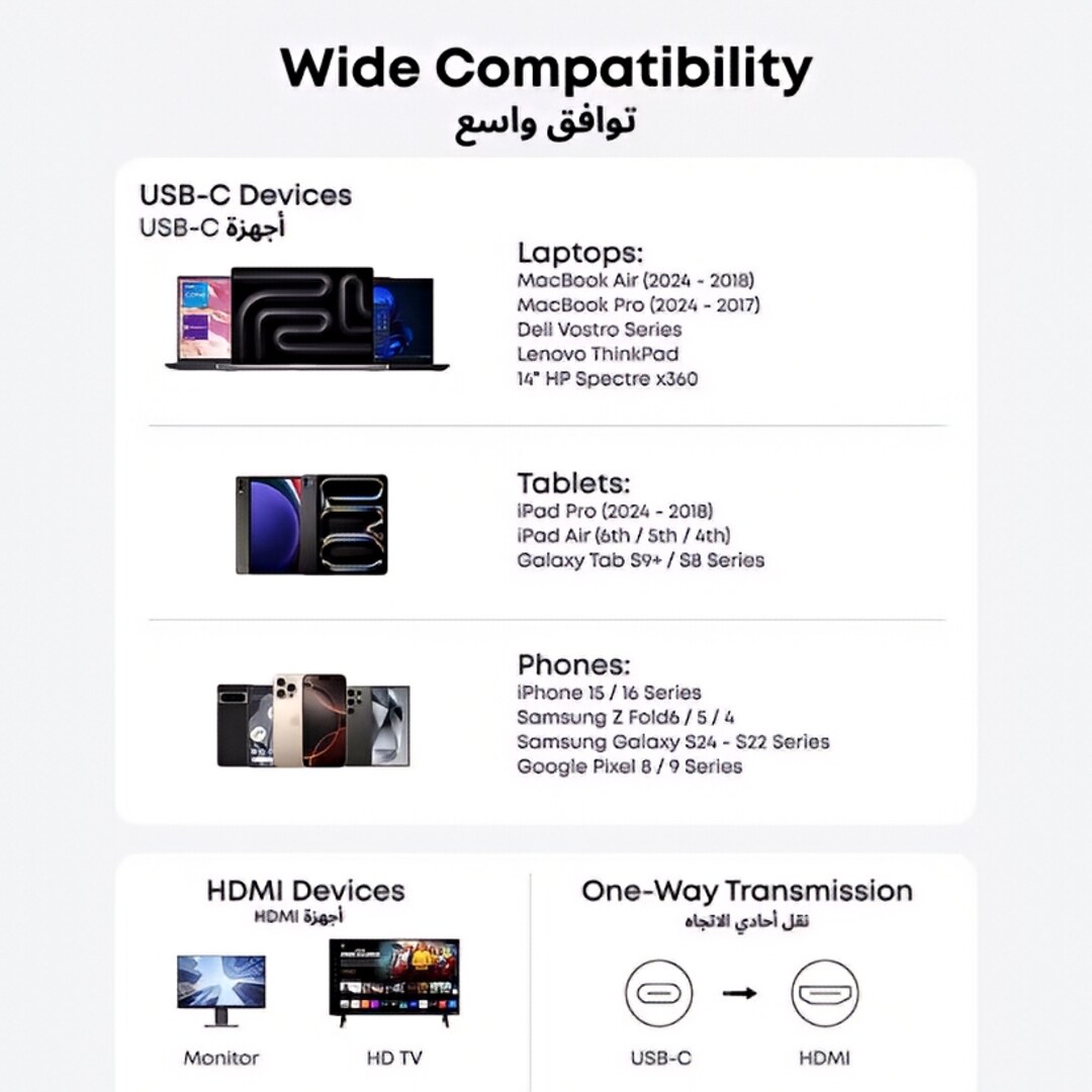 توافق واسع مع الأجهزة: يعمل بسلاسة مع أجهزة USB-C مثل ماك بوك، آيباد برو، سامسونج جالاكسي، ديل XPS، وغيرها من اللابتوبات والأجهزة اللوحية والهواتف الذكية.