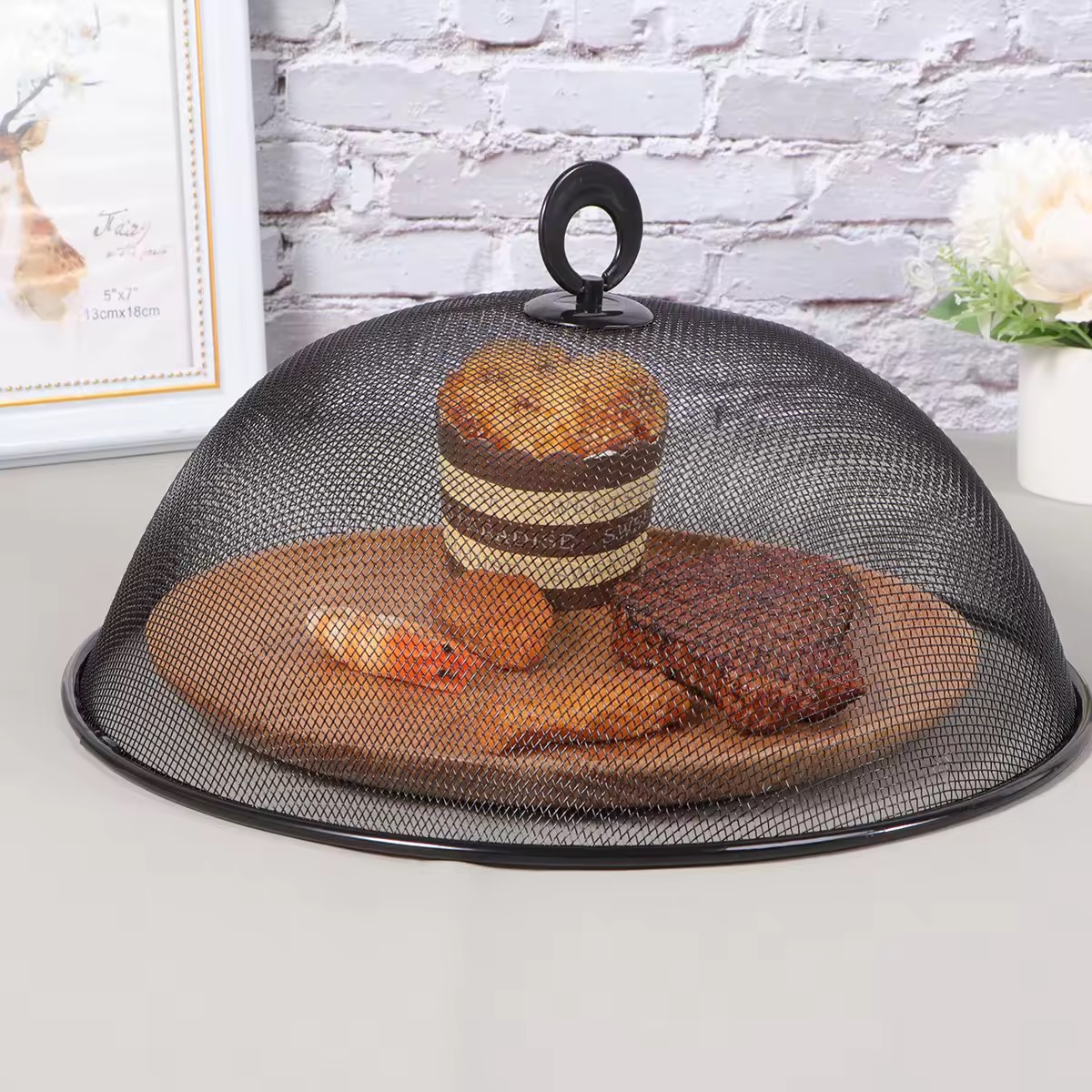 Round food cover, keeps pesky bugs off of your food while dining outdoors.