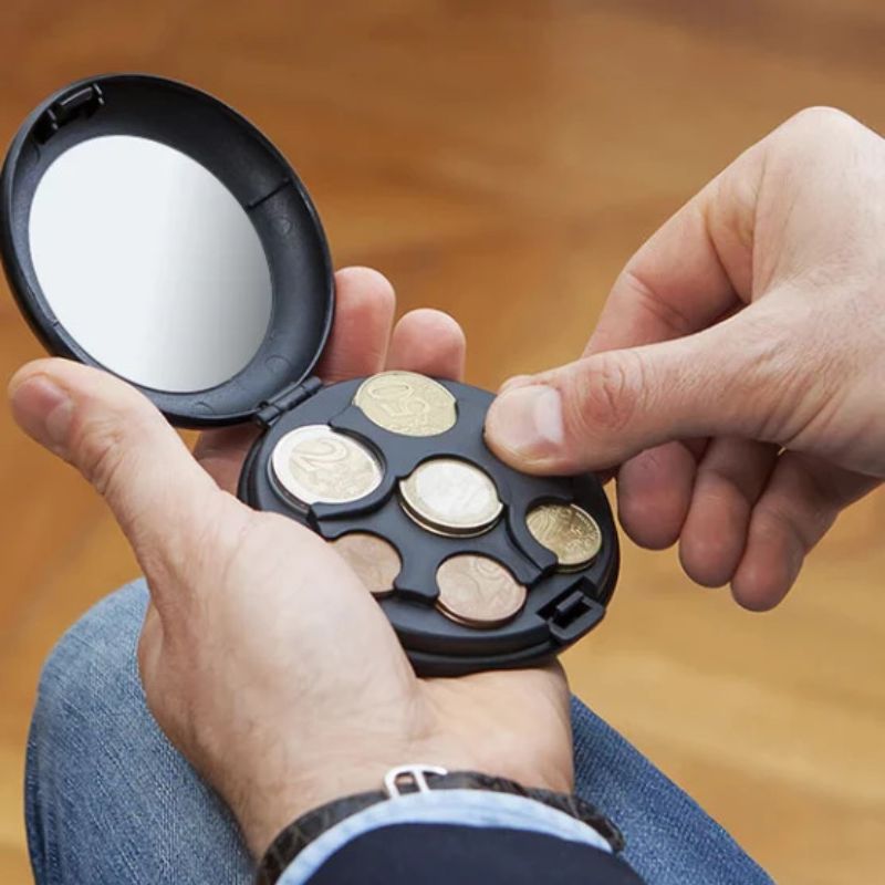 This Easy Coin Dispenser is a unique and great solution to carry your change. It's small and convenient. It makes dealing with coins simple, comfortable, and enjoyable! You'll never have to bother with loose coins again in your pocket or purse.