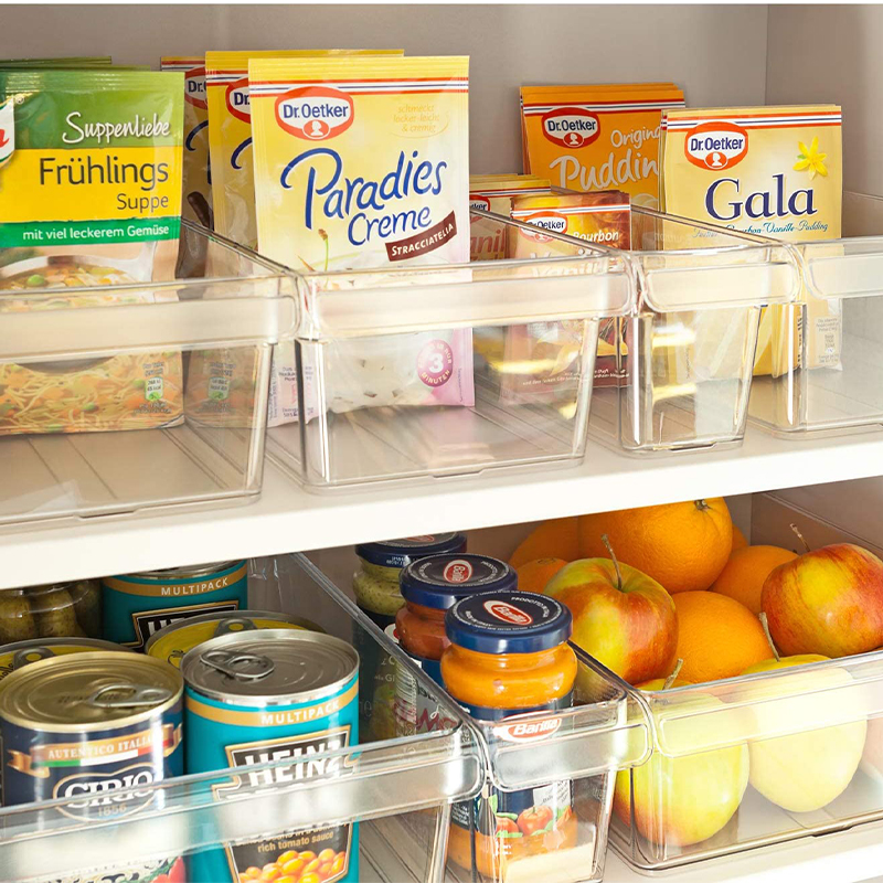 INTEGRATED HANDLE – The plastic clear storage bins feature integrated handle that allow for quick access and easy reorganization; built-in feet slightly elevate the bin off of the fridge, freezer, pantry, and cabinet shelves