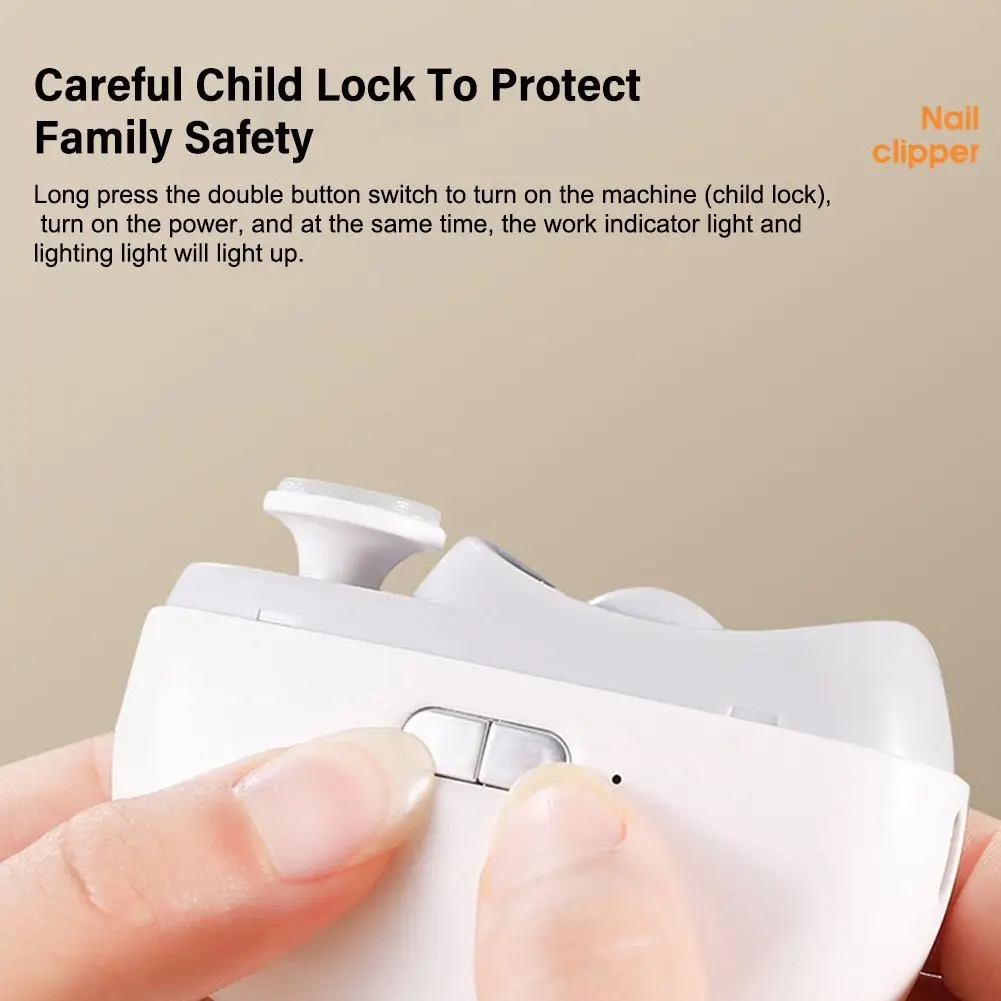 Automatic Electric Nail Clippers Nail Clippers Manicure Nail Care Set Electric Nail Scissors Caring child lock, protecting family. Press and hold the double key to turn on (child lock), turn on the power, and at the same time, the work indicator light and lighting light are on. Two options available to meet different usage needs Fine polishing without leaving sharp nails, 360 rotations polishing to smooth rough and resist scratching skin Both gears can be used to adjust the shining and cutting. Short press the left key to activate the first gear, and then short press the left key to gears, low gear, and high gear Back storage design, buckle up the storage compartment cover to pour out nail shavings.