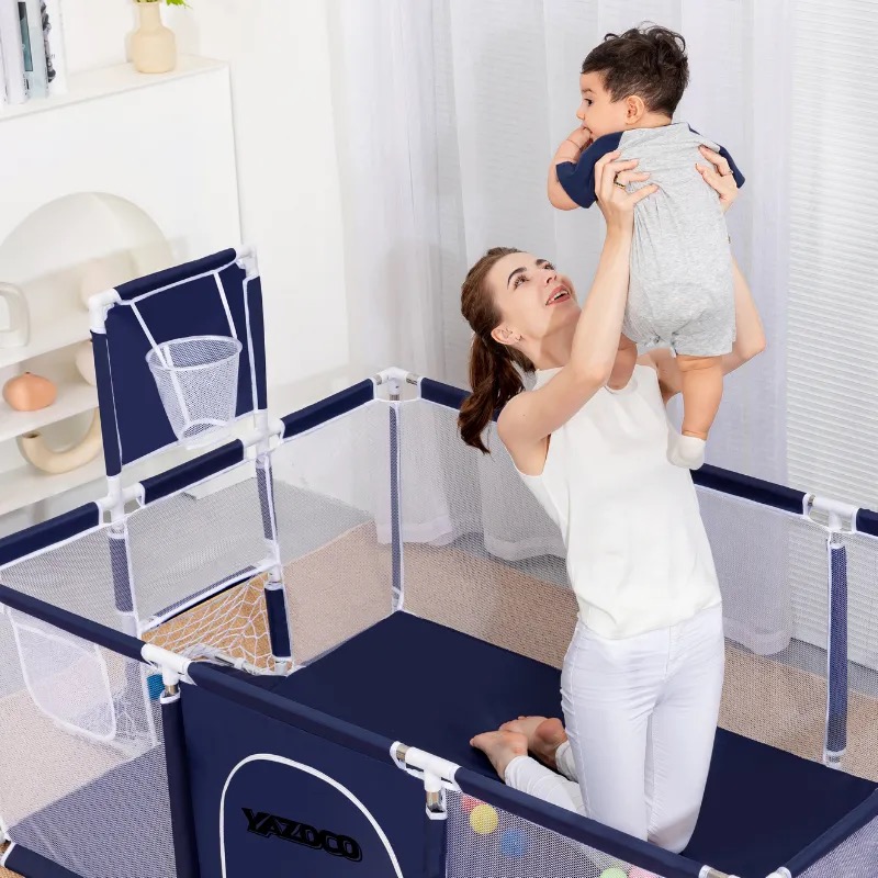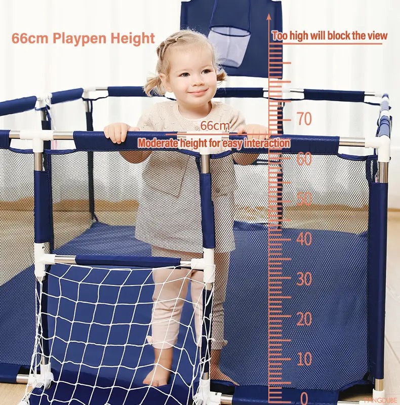 4、Large playground and scientific height: 126*126*66cm large space, safe playground for baby's feet. With basket design and football net design, babies can play by themselves, liberating their nature. The height of the fence is enough for babies to stand and walk, and there is enough space in the play pen to explore the surroundings.