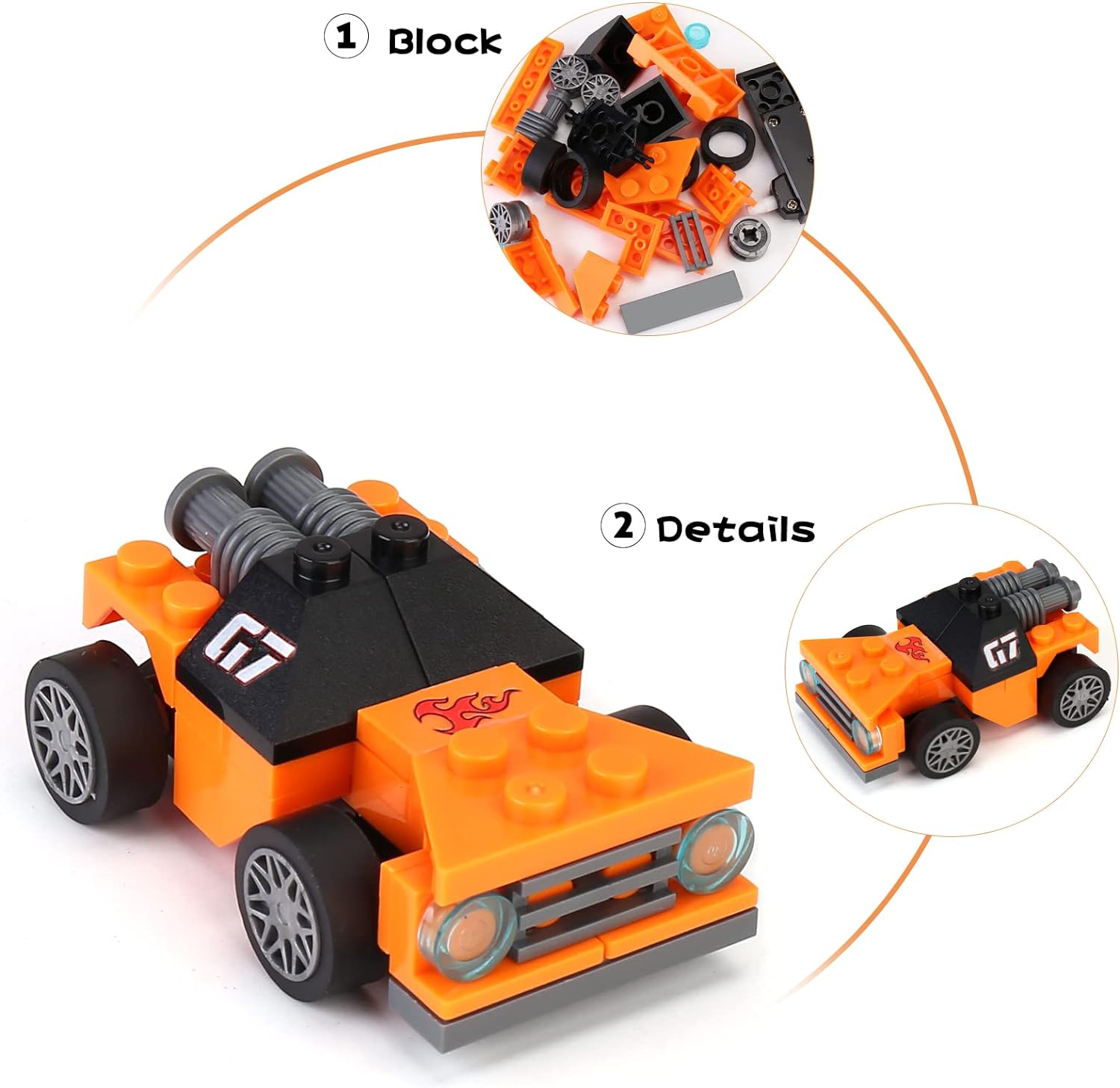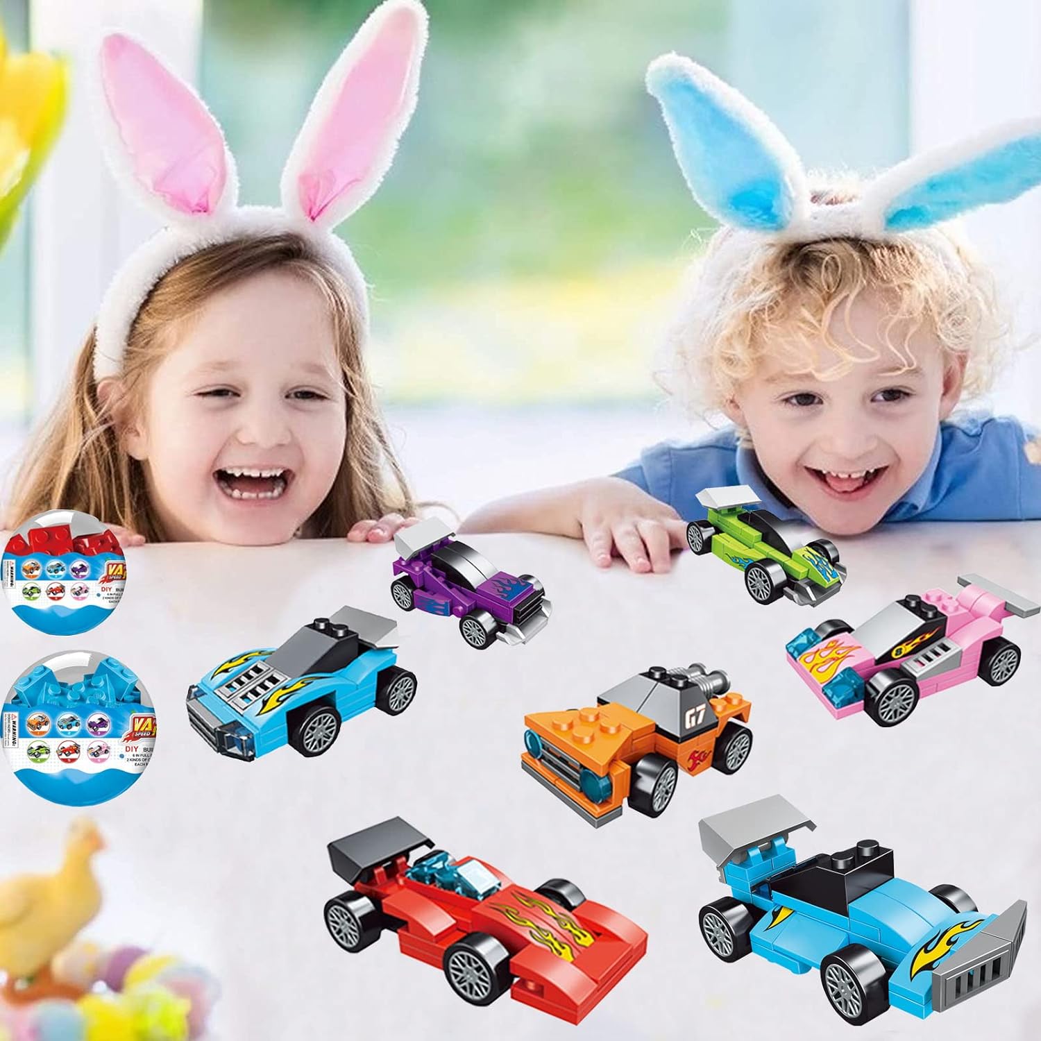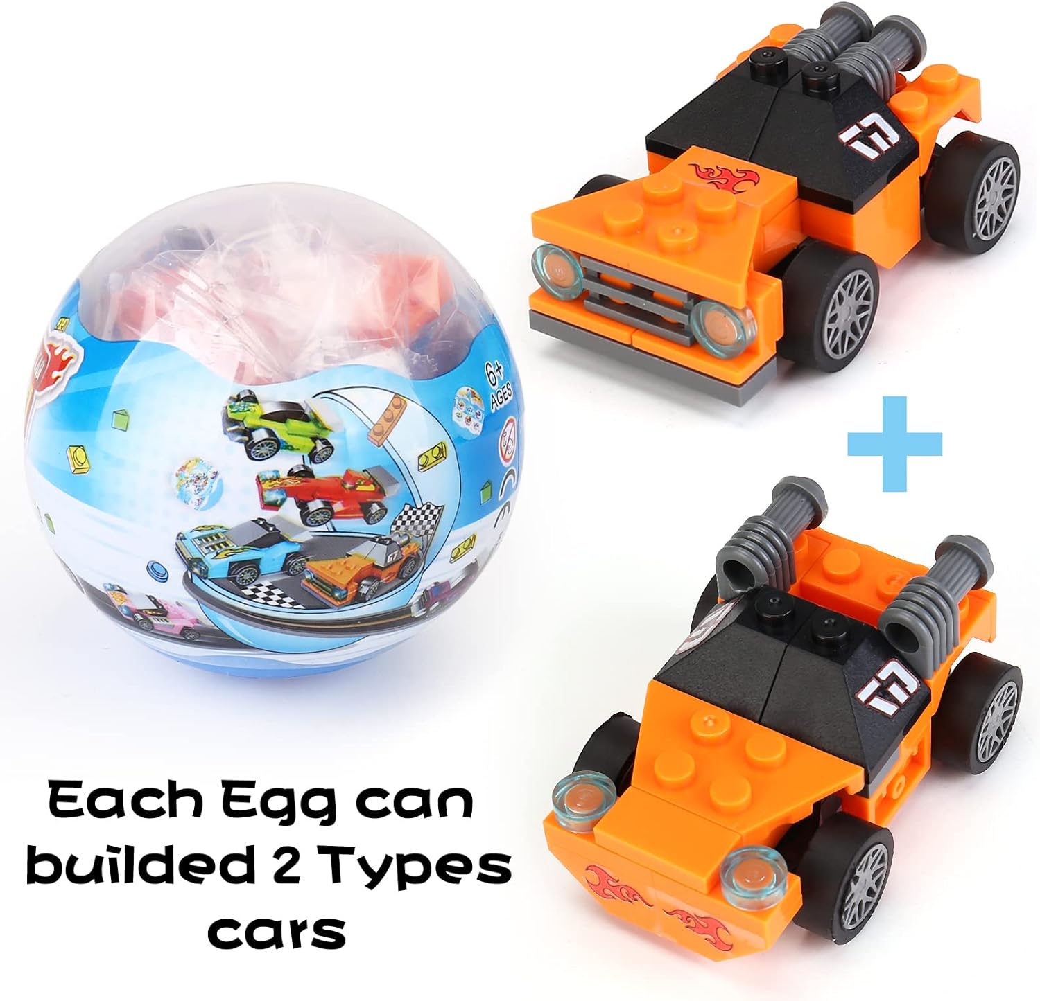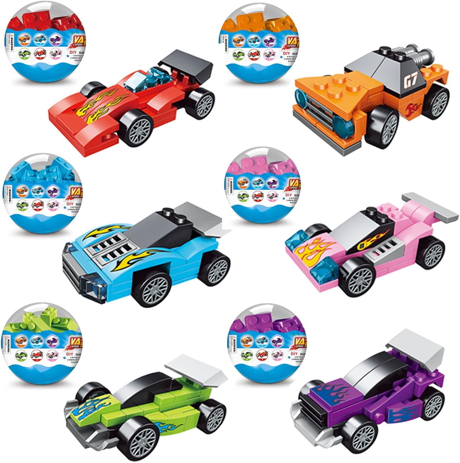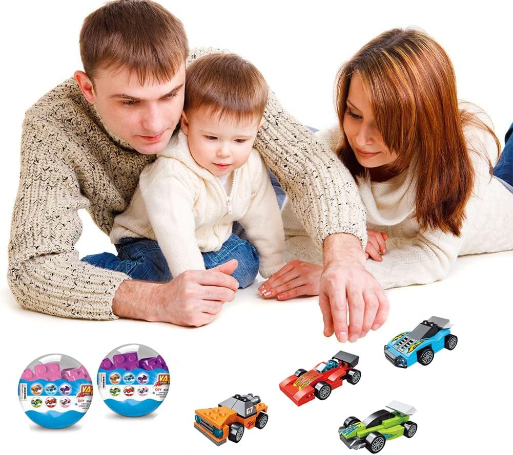 SUPER VALUABLE SET: Prefilled egg surprise toys include 6 eggs filled with 6 styles race car building blocks toys. Each eggs measure 3.3" Tall x 2.3" Diameter.