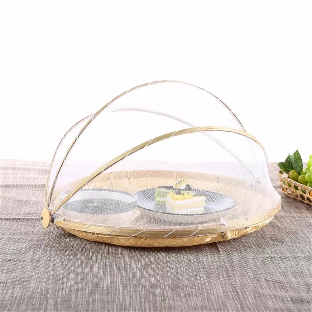 Natural bamboo Domed Mesh Cover-healthy, multifunction, Handmade storage tent basket. Domed Mesh Cover Protects Food from Bugs & Insects - Cover Retracts for Storage, it’s good breathability.