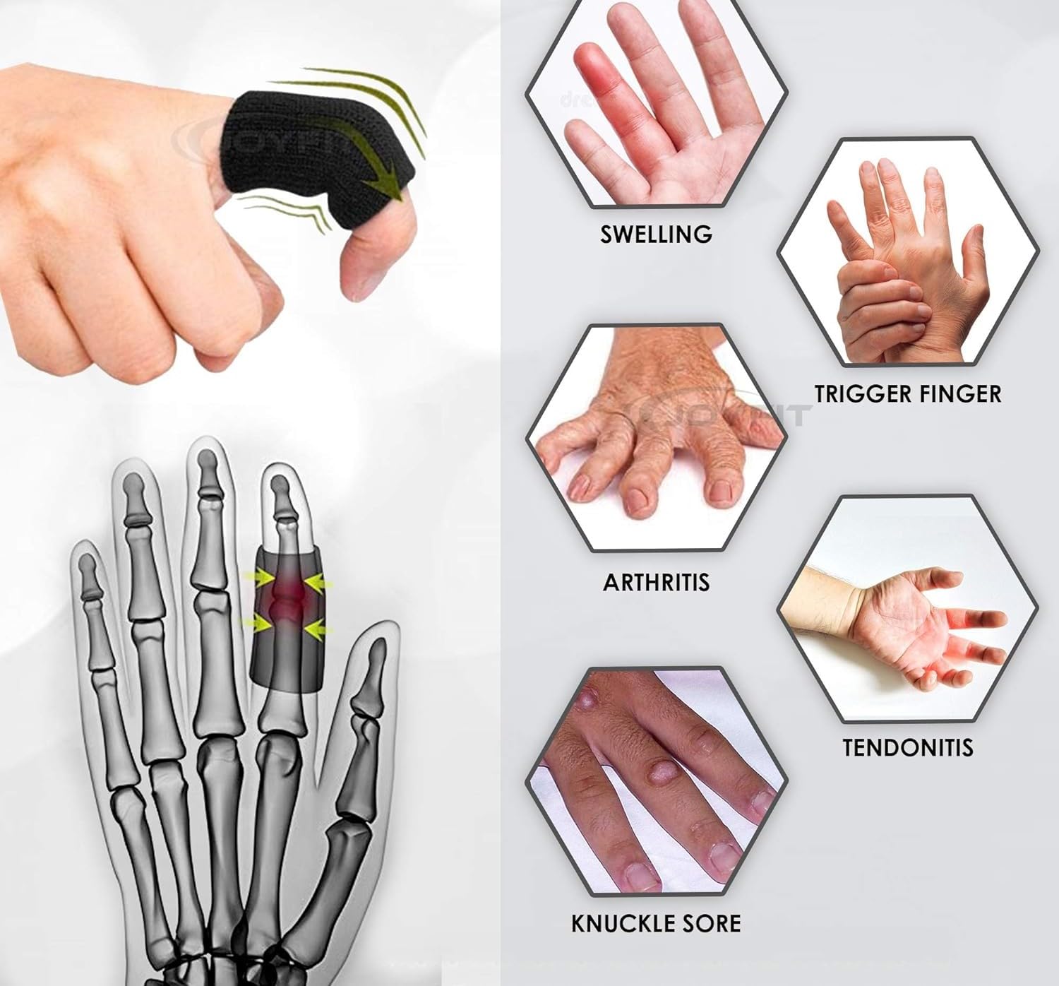 Pain Relief: Experience immediate relief from finger pain, strain, and discomfort. The comfortable cushion pressure in these sleeves provides targeted support to alleviate discomfort associated with various sports and activities, allowing you to perform at your best without any hindrance.