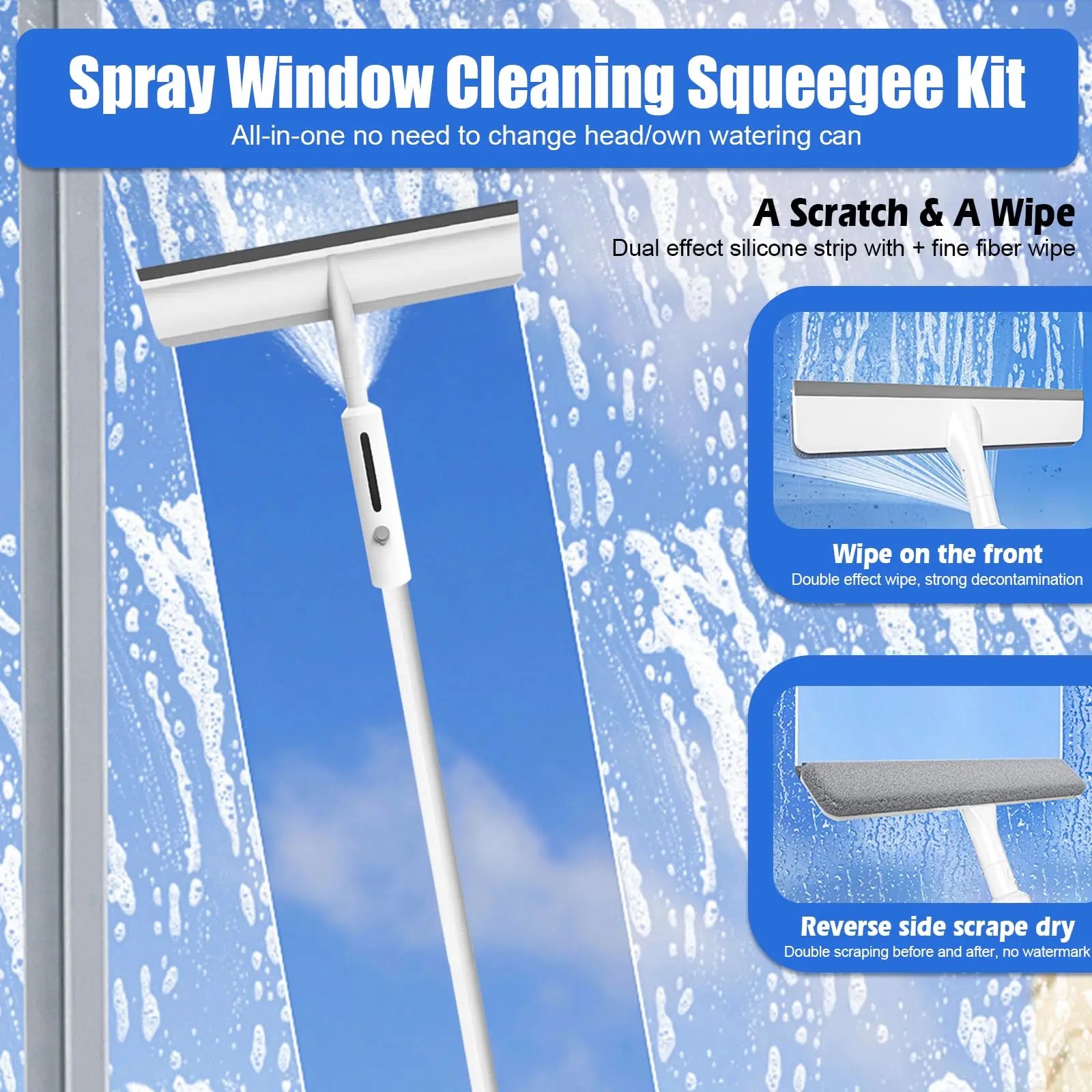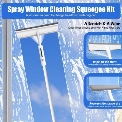 Multipurpose Squeegee with Spray Function: Built-in spray bottle for easy cleaning without a bucket; ideal for various surfaces including glass, mirrors, and vehicle windows.