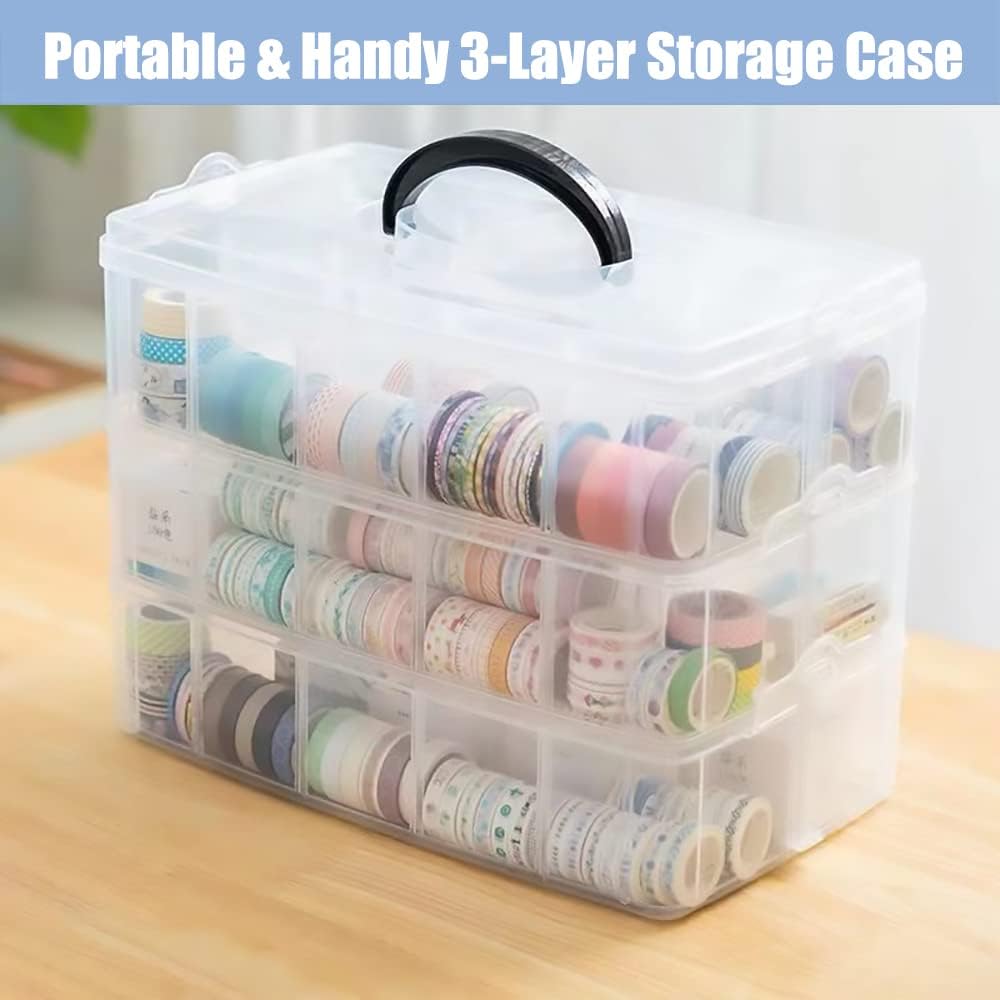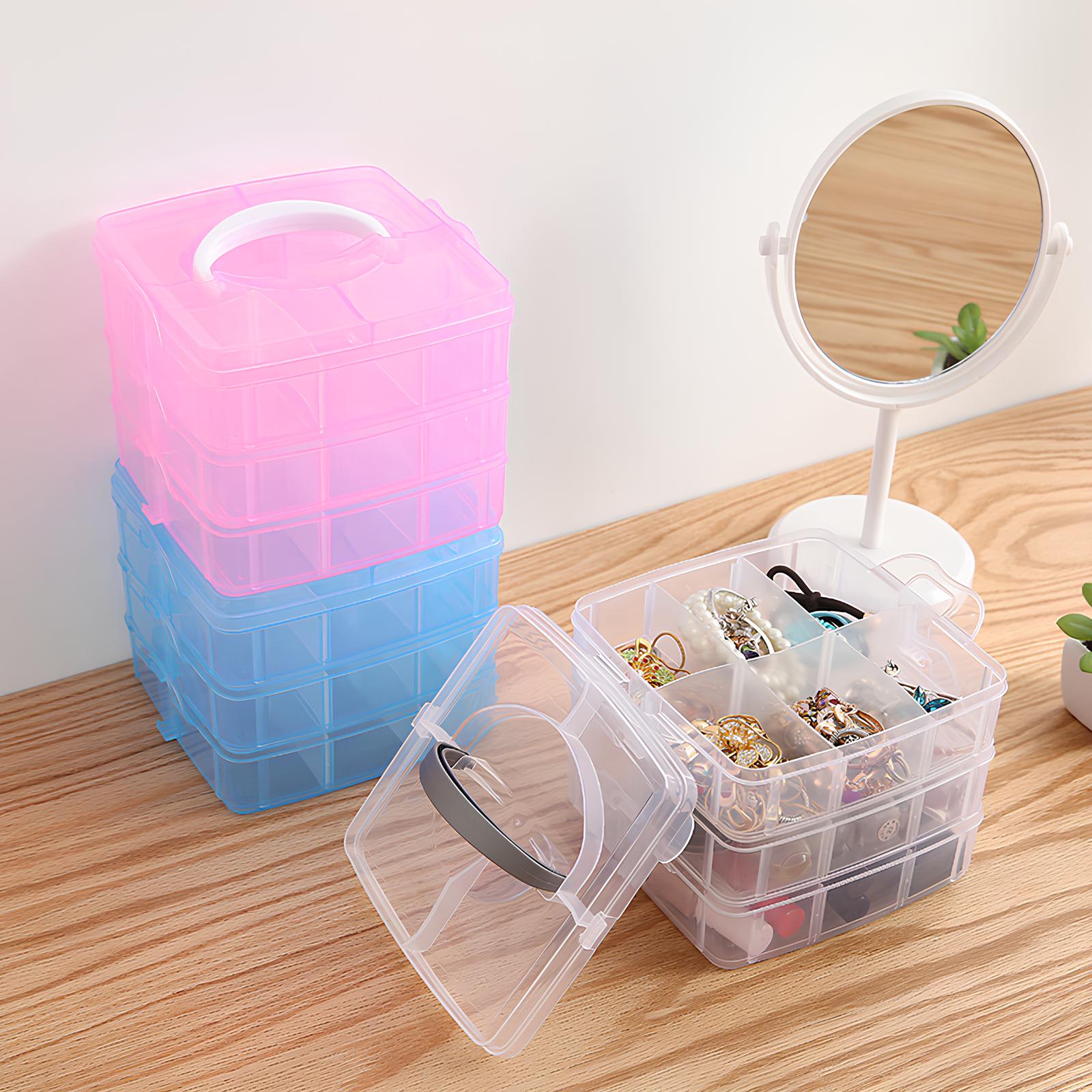 Organizer Storage Box: Package includes 1 Plastic Clear Container Case, having 3 layers Stackable Storage Container, Large box with 10 grids per layer, totally 30 compartments, and small box with 6 grids per layer, totally 18 compartments can save more valuable space.