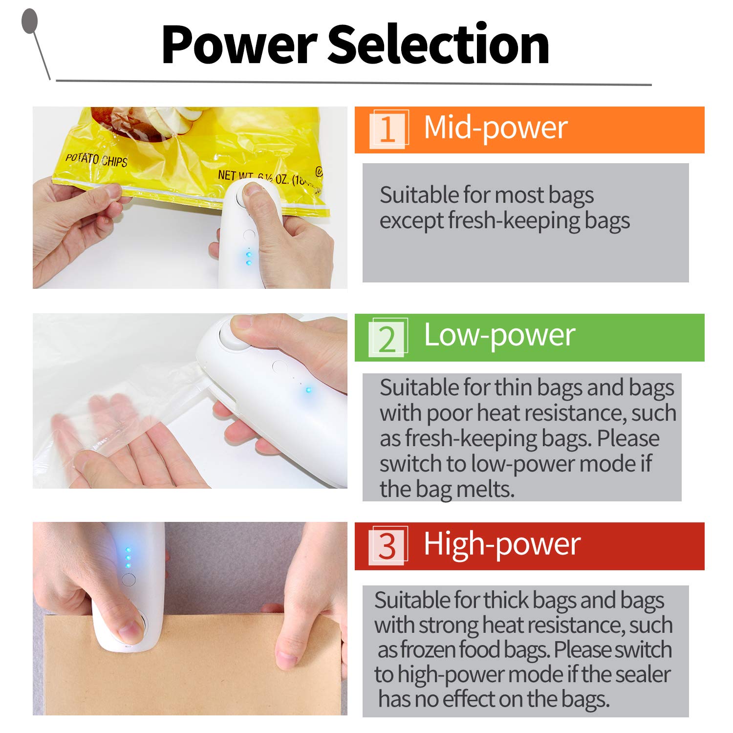 Three sealing modes adjustable sealing modes: heat sealer has 3 sealing modes to choose from (mode for thick bags, ordinary bags and super thin bags). It is a great help for you to store your leftover snacks, food, fruits and so on.