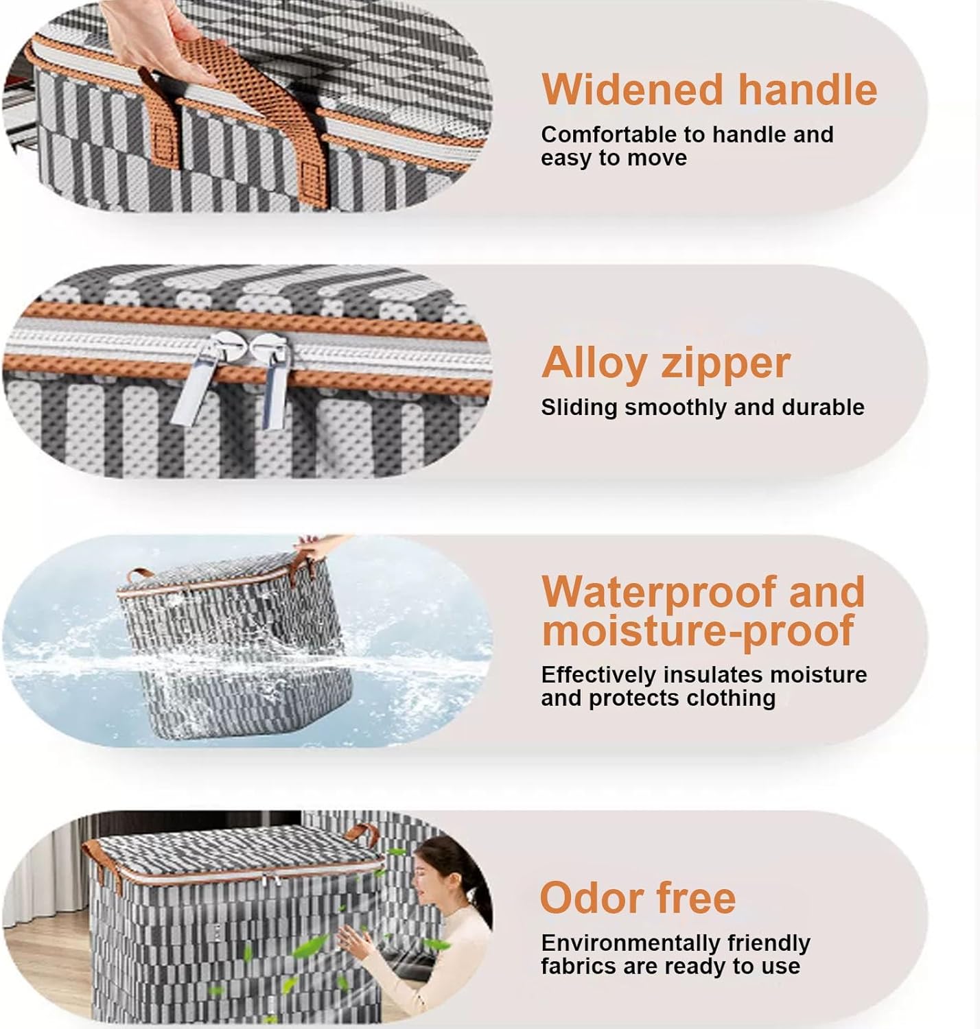 ZIPPER STORAGE BOX WITH LID AND HANDLE Our storage container was creatively designed with a locking lid. which can protect your clothes from dust and water to reach your storage items. They have a handle on one side so you can pull them out with ease.