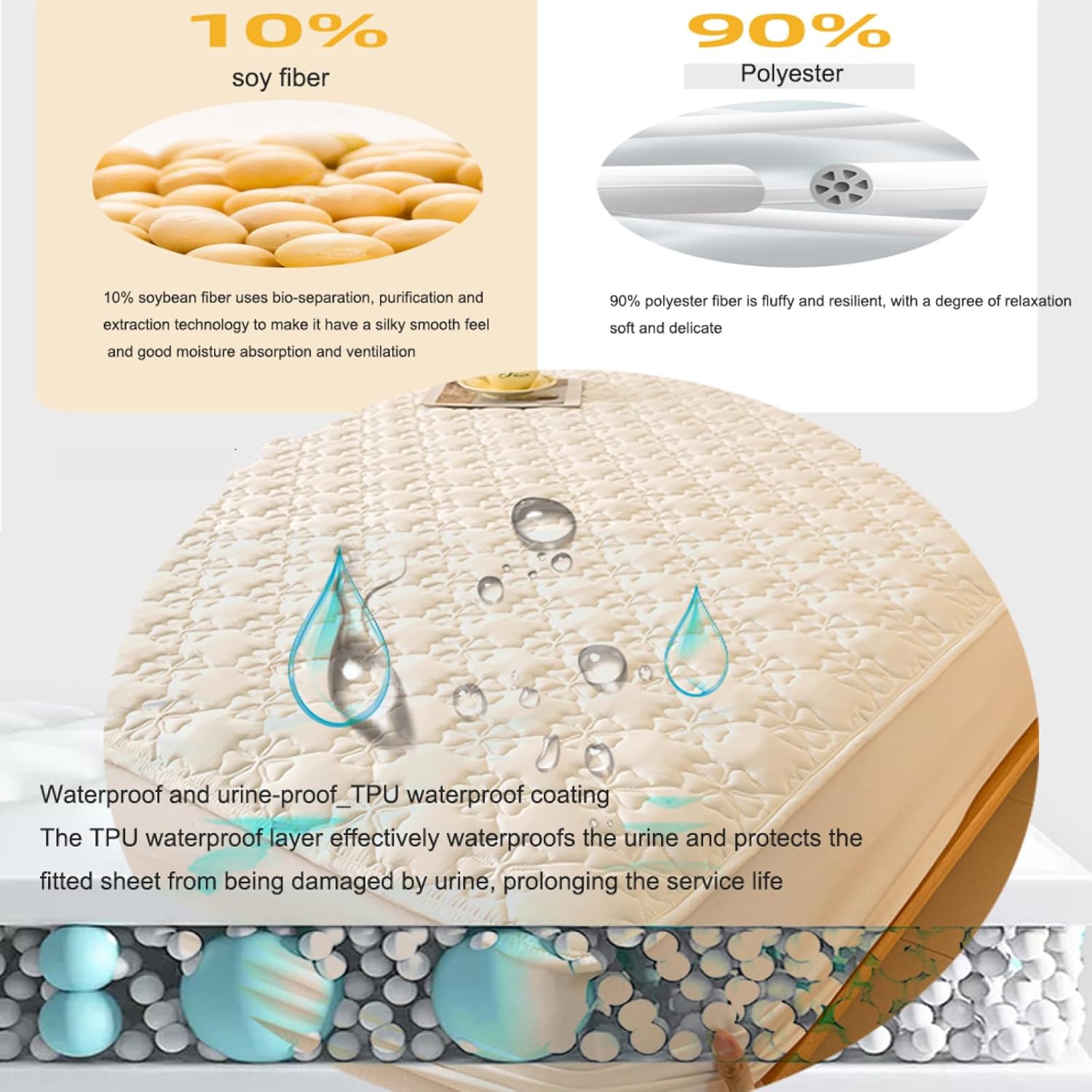 100% waterproof: the main part of the fitted sheet is made of smooth jersey fitted sheet, artificial cotton filling and waterproof film (TPU), which will not damage your mattress by children's accidents at night. Synthetic cotton absorbs all liquids immediately, TPU film insulates the penetration of liquids into the mattress.