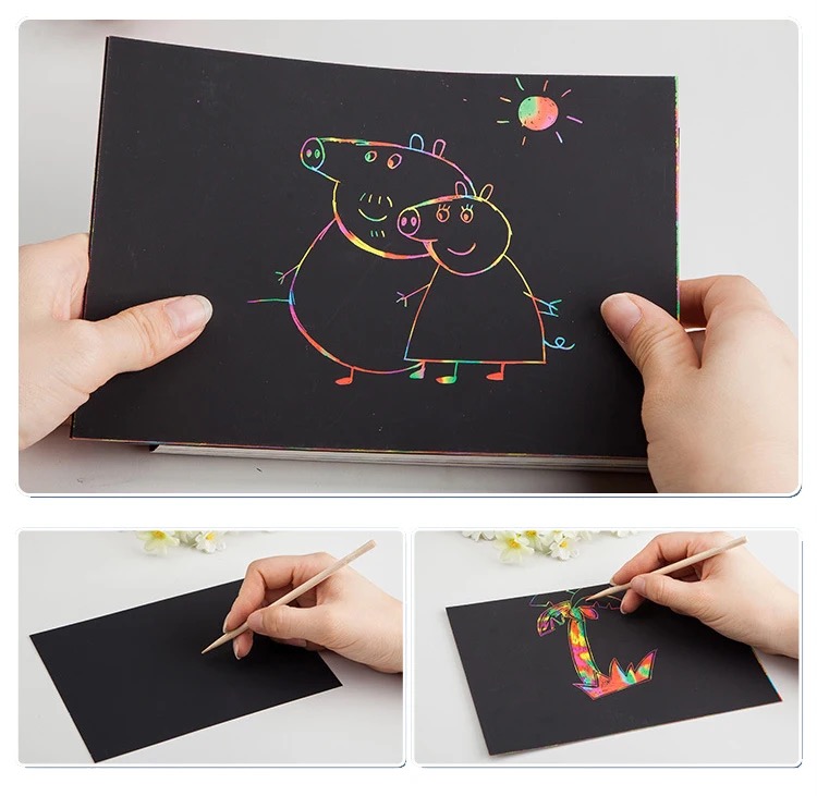 Interesting drawing: they are easy to get attracted by this rainbow scratch paper drawing way, they can also DIY the paper and cut out the patterns they like
