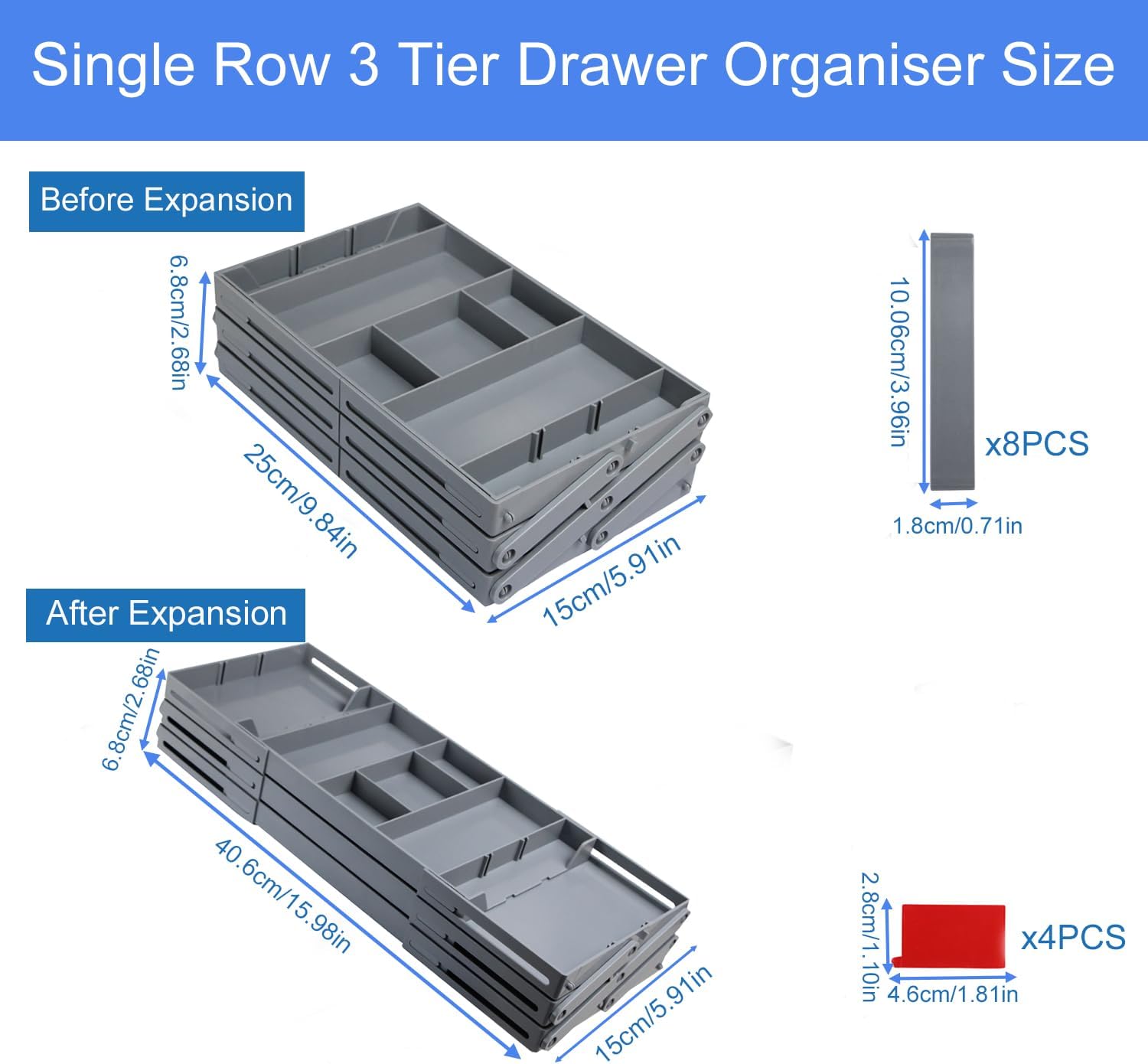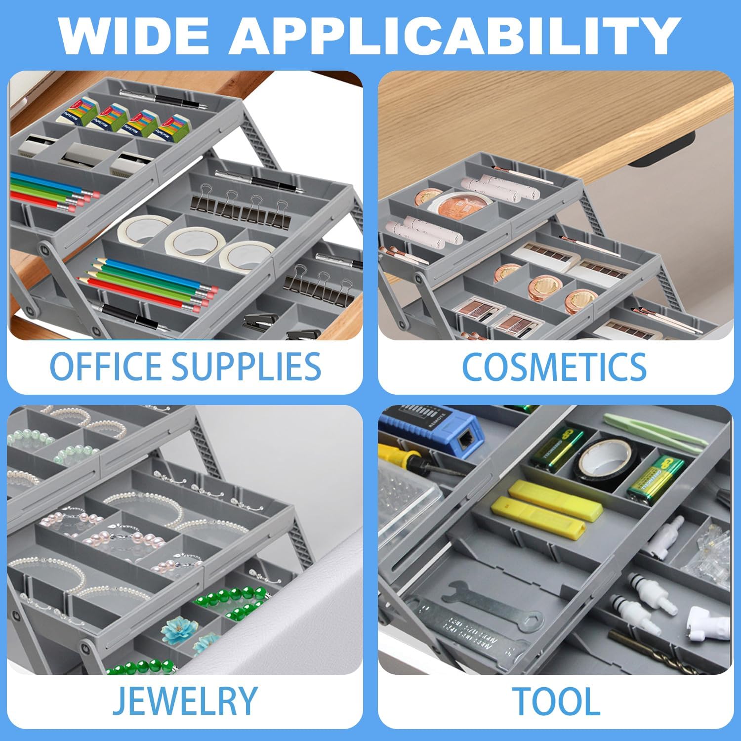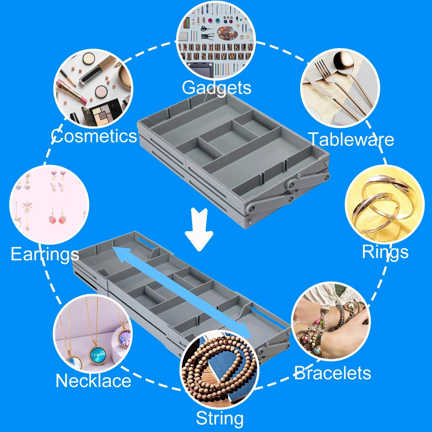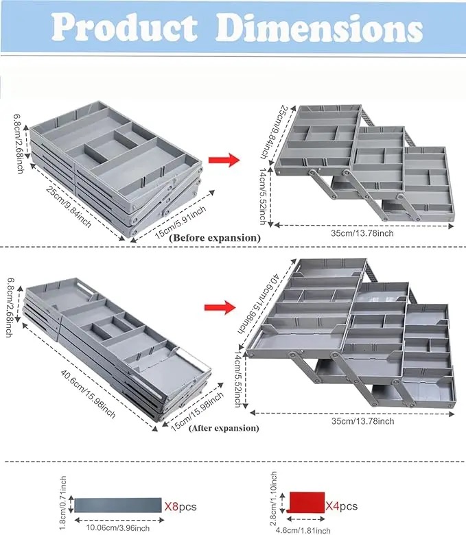 This makeup organizer tray provides flexible adjustment of storage boxes, keeping your drawers tidy. 2. It's perfect for organizing tableware in the kitchen, countertop items in the bathroom, or any small items in the bedroom or living room.