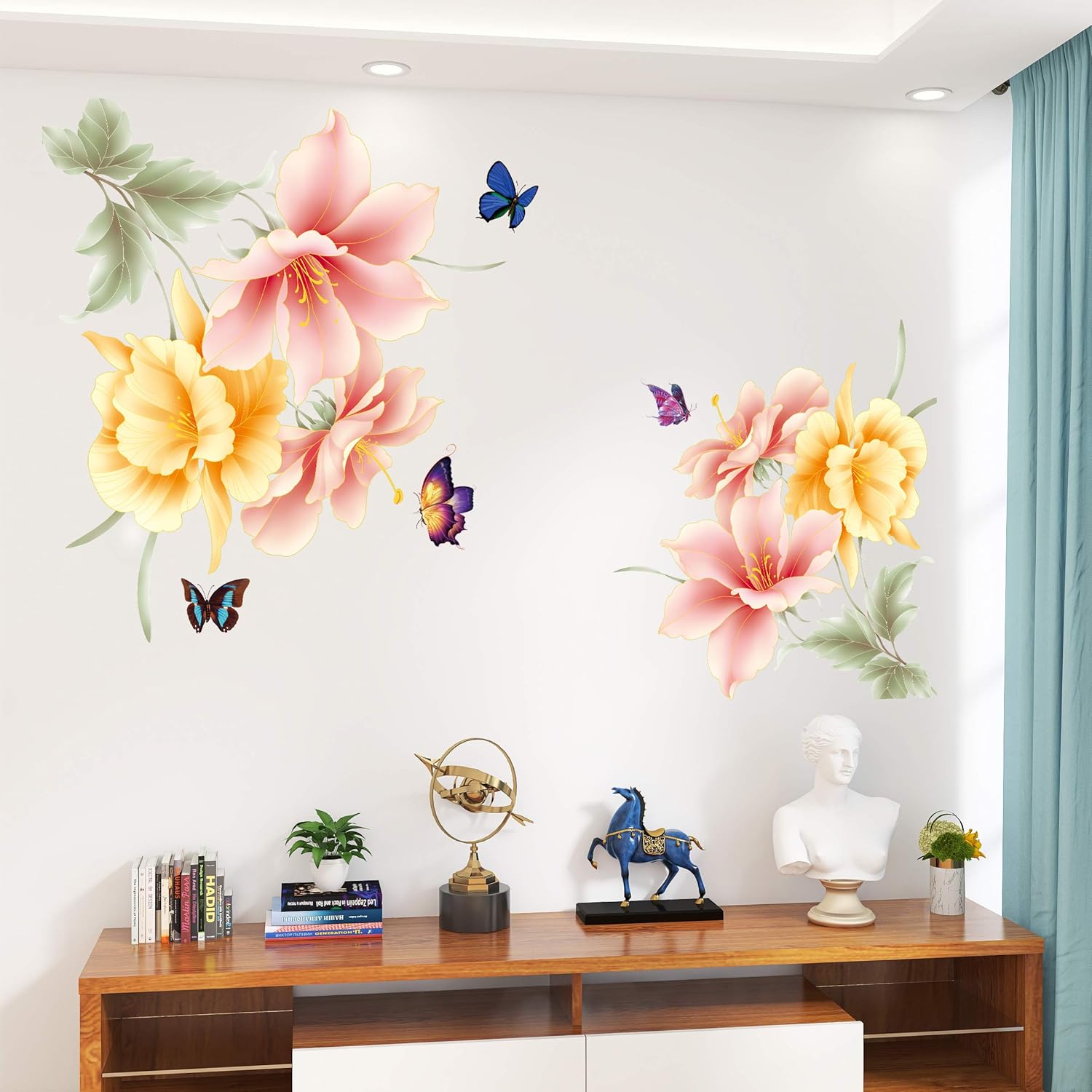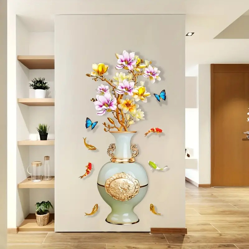 The pattern of the wall stickers is a Chinese butterflies vase. Peony flowers in the gold vase look very elegant and noble.
