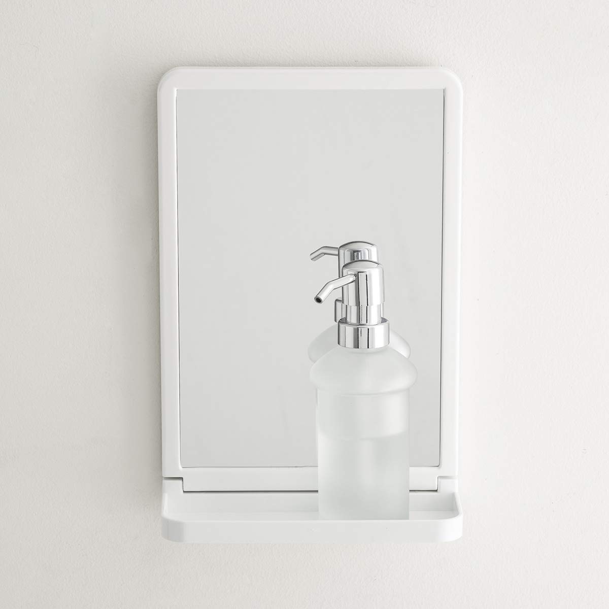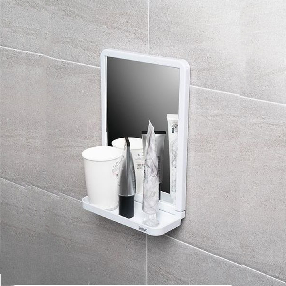 Integrated Mirror & Shelf Design: Rectangular bathroom mirror combined with a practical built-in shelf for holding daily essentials such as soap, toothbrushes, or skincare items.